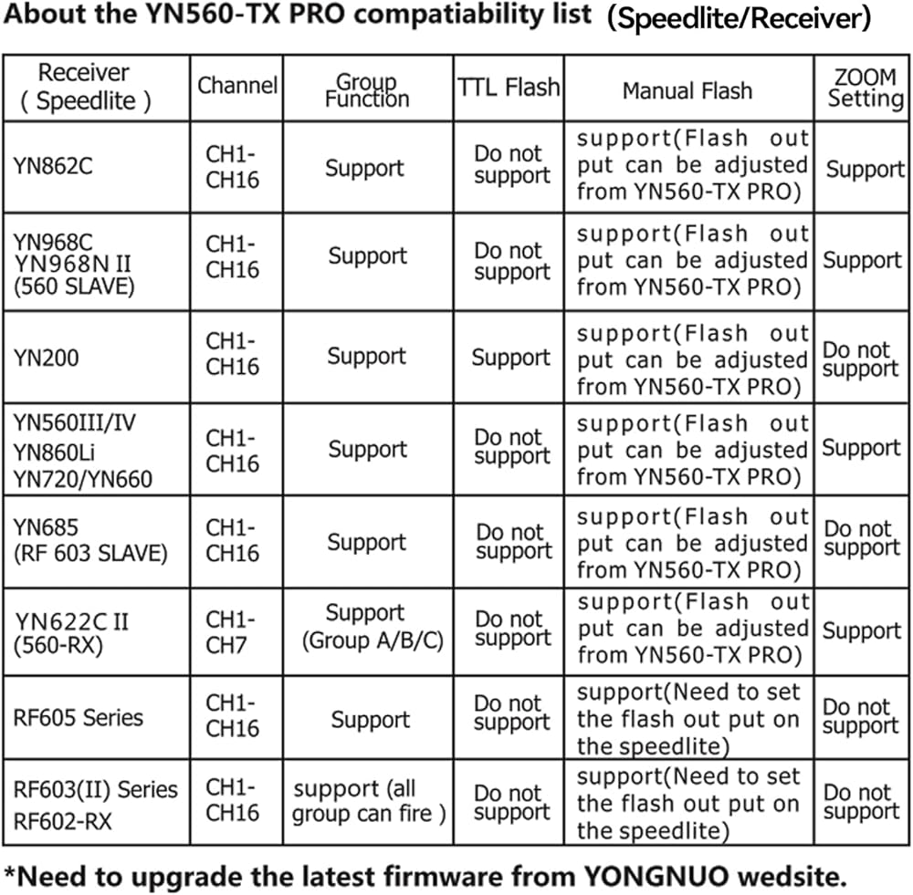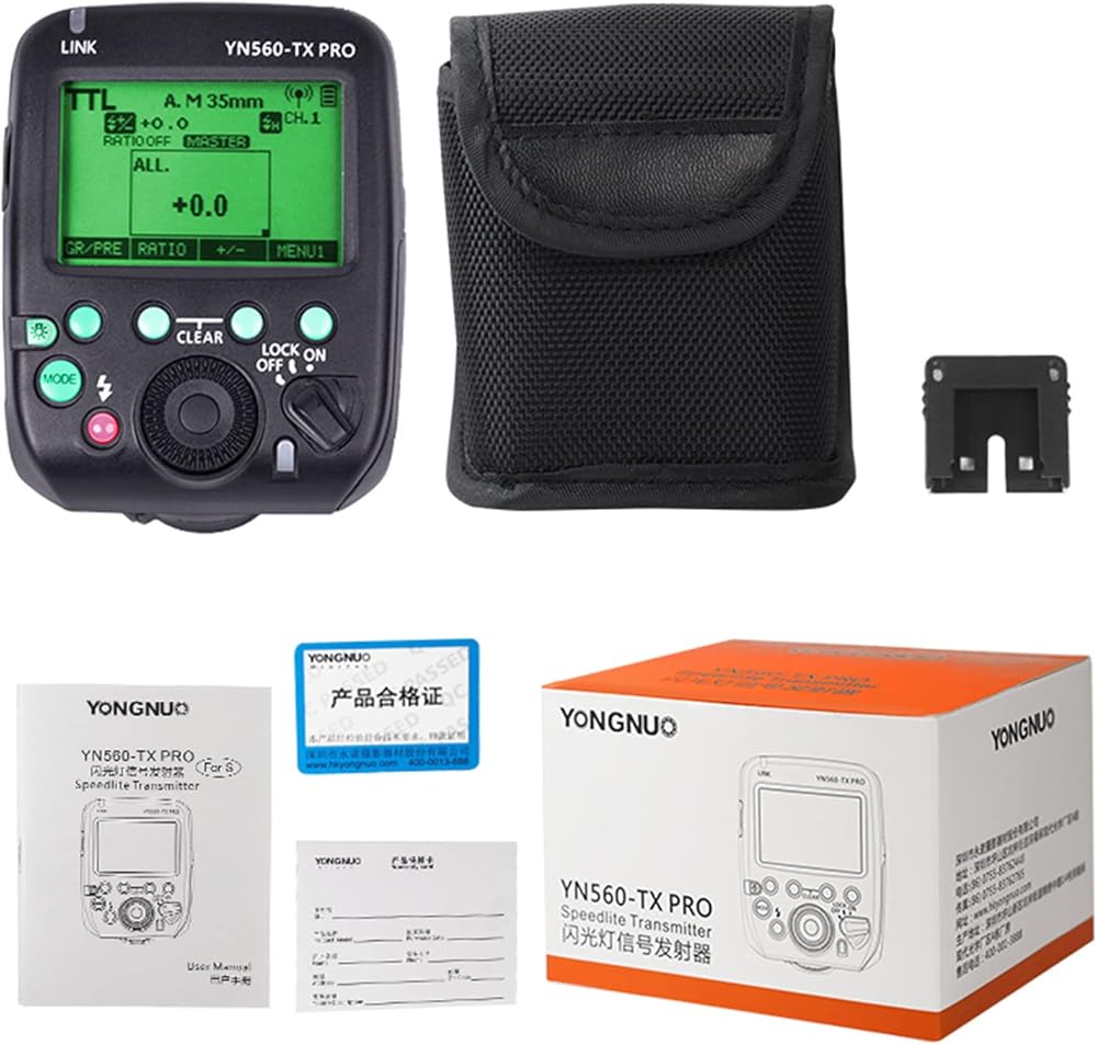 YN560TX PRO adopt 2.4G wireless technology, support wireless trigger to YN862C/YN968C/YN200/YN560III/YN560IV/YN860Li/YN720/YN660/YN685 speedlite; Support wireless shutter receiver of YN622CII/RF605 Series/RF603II Series/RF602-RX.