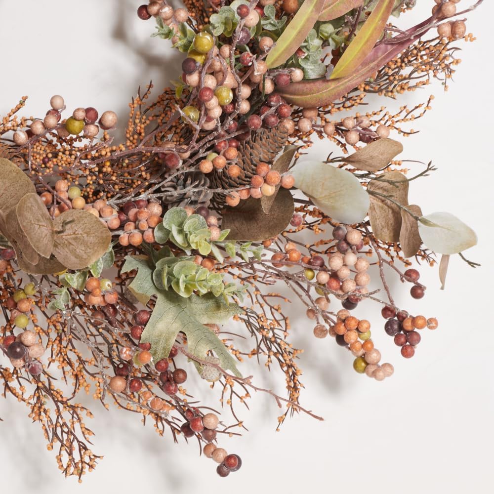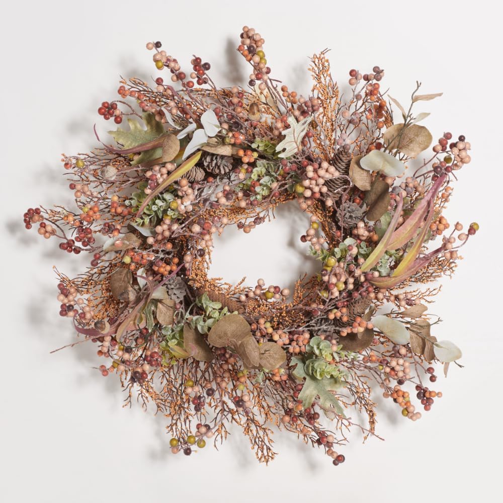 [DECORATIVE ARTIFICIAL WREATH]: This wintry wreath features artificial pine cones and blueberries to make for an enchanting winter home décor accent