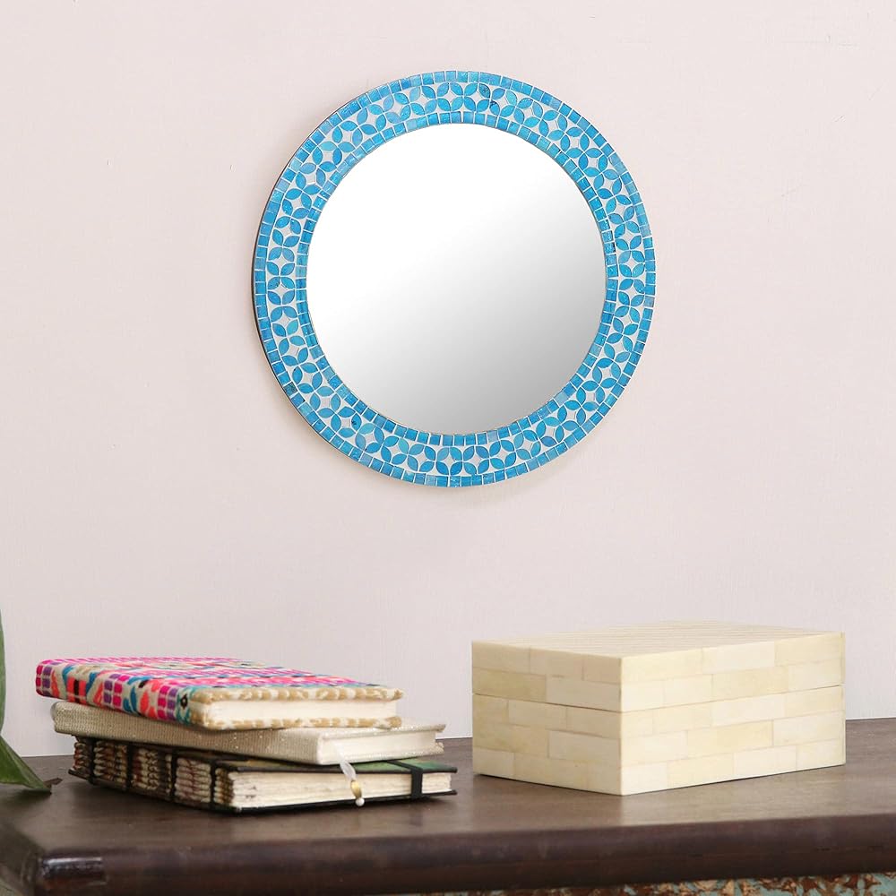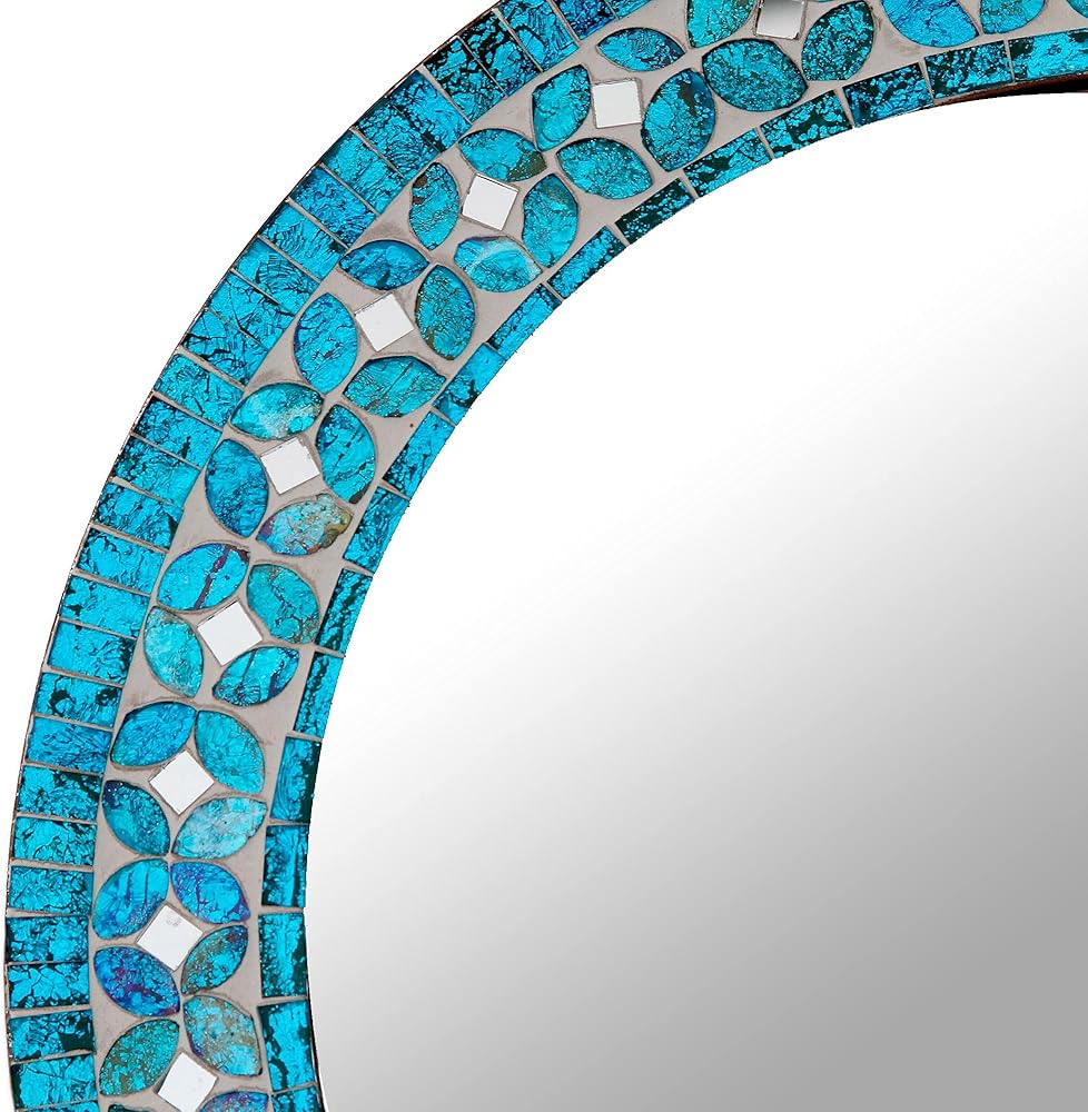 This iridescent turquoise wall mirror from kamal in India is crafted by hand with shimmering glass mosaic tiles on a wood base. The round mirror frame features a cheerful flower design between tidy rows of tiles.