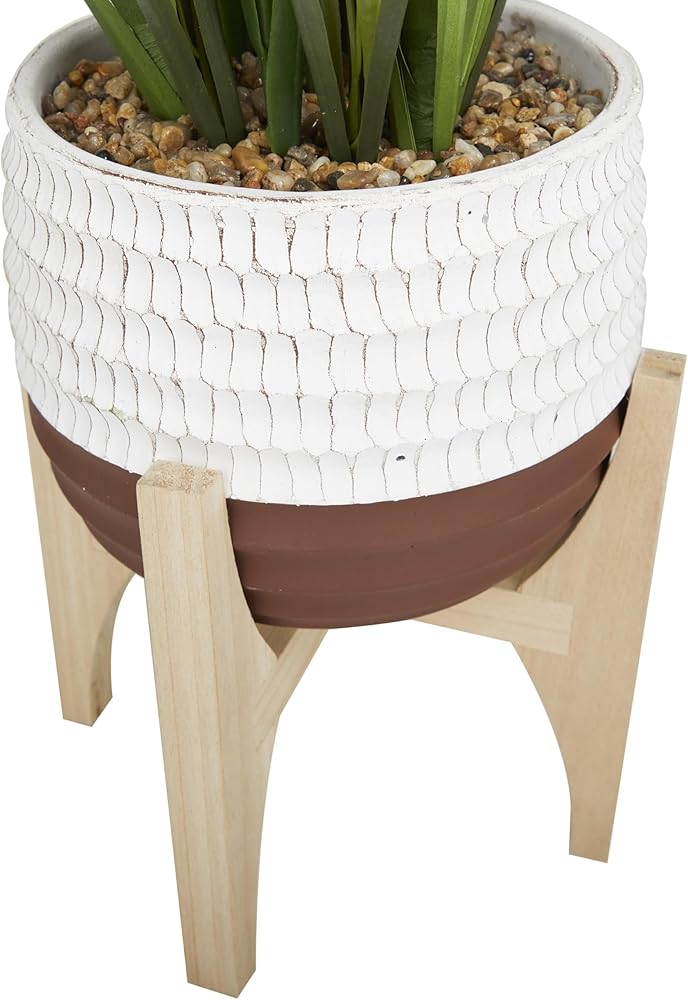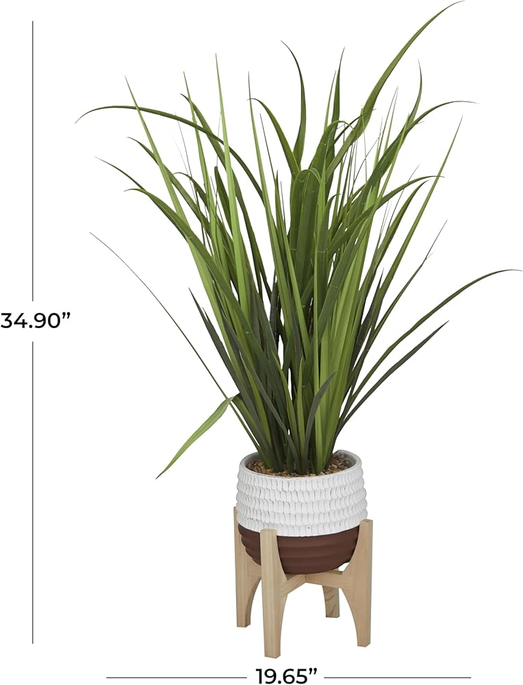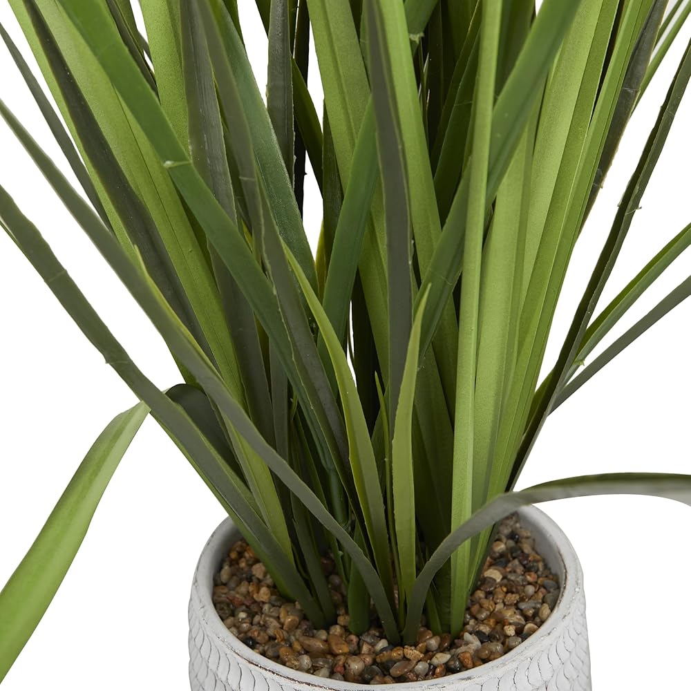 Add some greenery to your decor with no keep up effort with these artificial foliage. Add height and textured to your floor space with this artificial plant and freshen up your existing decor. Our vivid green artificial grass with white and brown pot will play an important role to your decor, especially on a table top, shelf, or mantel. This item ships in 1 carton. The artificial plant is made of resin inside a round pot crafted of porcelain. Faux foliage artificial plant makes a great gift for any occasion. Suitable for indoor use only. This item ships fully assembled in one piece. This is a single green colored fake plant. Contemporary style.