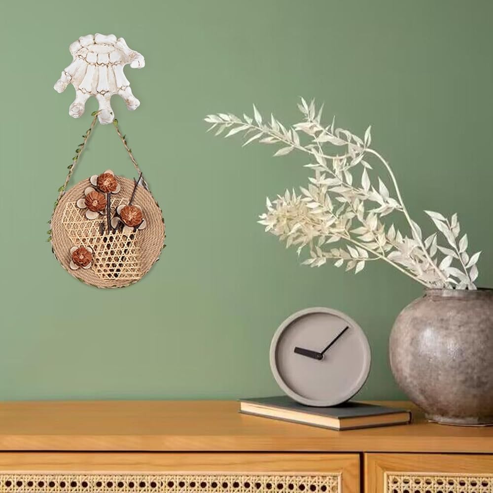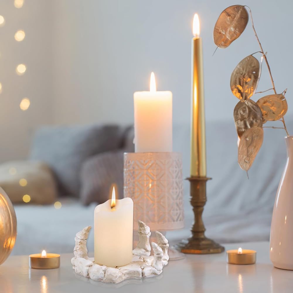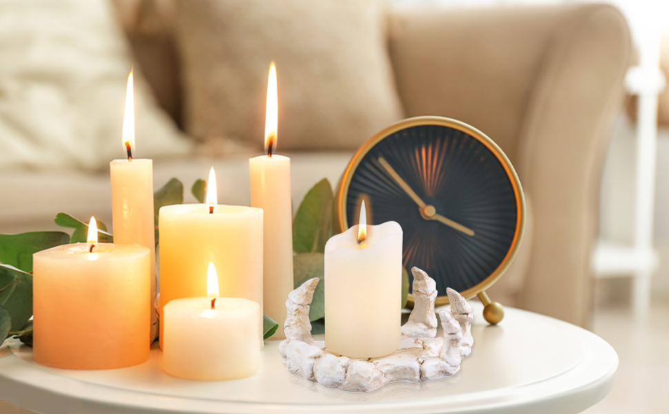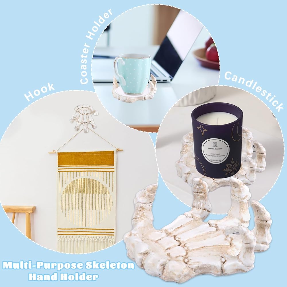 【Multi-Function】This skeleton hand candle holder has 3 in 1 function, bringing you great convenience. Candle Holder--You can place LED candles or scented candles on it, the dim candlelight with the scary hand bone creates a scary atmosphere for Halloween. Hook - Hang Halloween themed decorative pendants on the door or wall to add a gloomy atmosphere. Coaster Storage - Perfect for storing coasters after use to reduce desktop clutter.