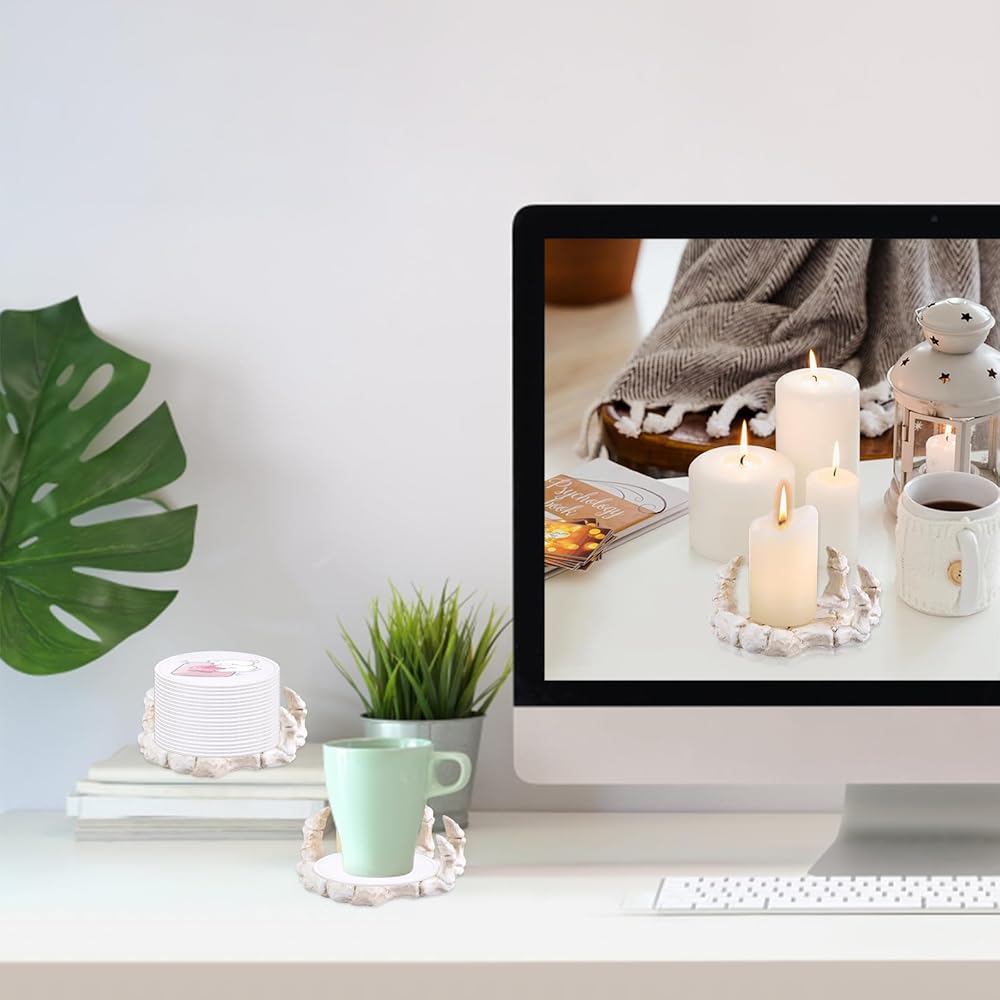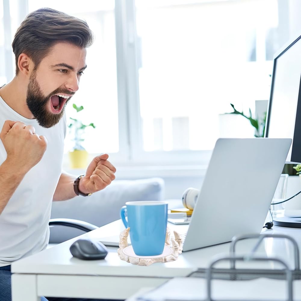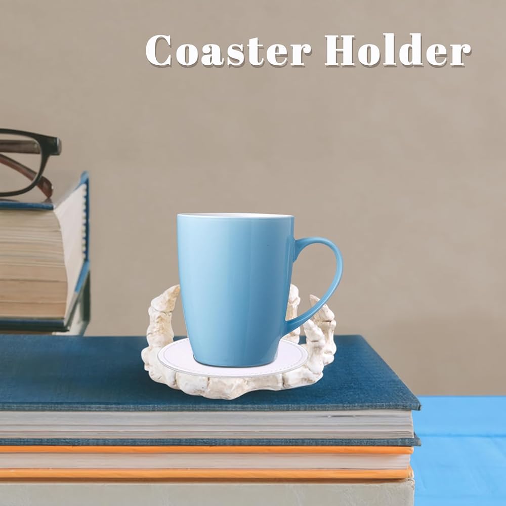 【Size】The size of this skull hand candle holder is 12.5*11*5.5cm / 4.92*4.33*2.17in, convenient to store 9.5cm/3.74in coasters to keep your desktop in order, a must-have for daily home/decorating. It can also hold LED candles and scented candles to add spookiness to your Halloween desktop.