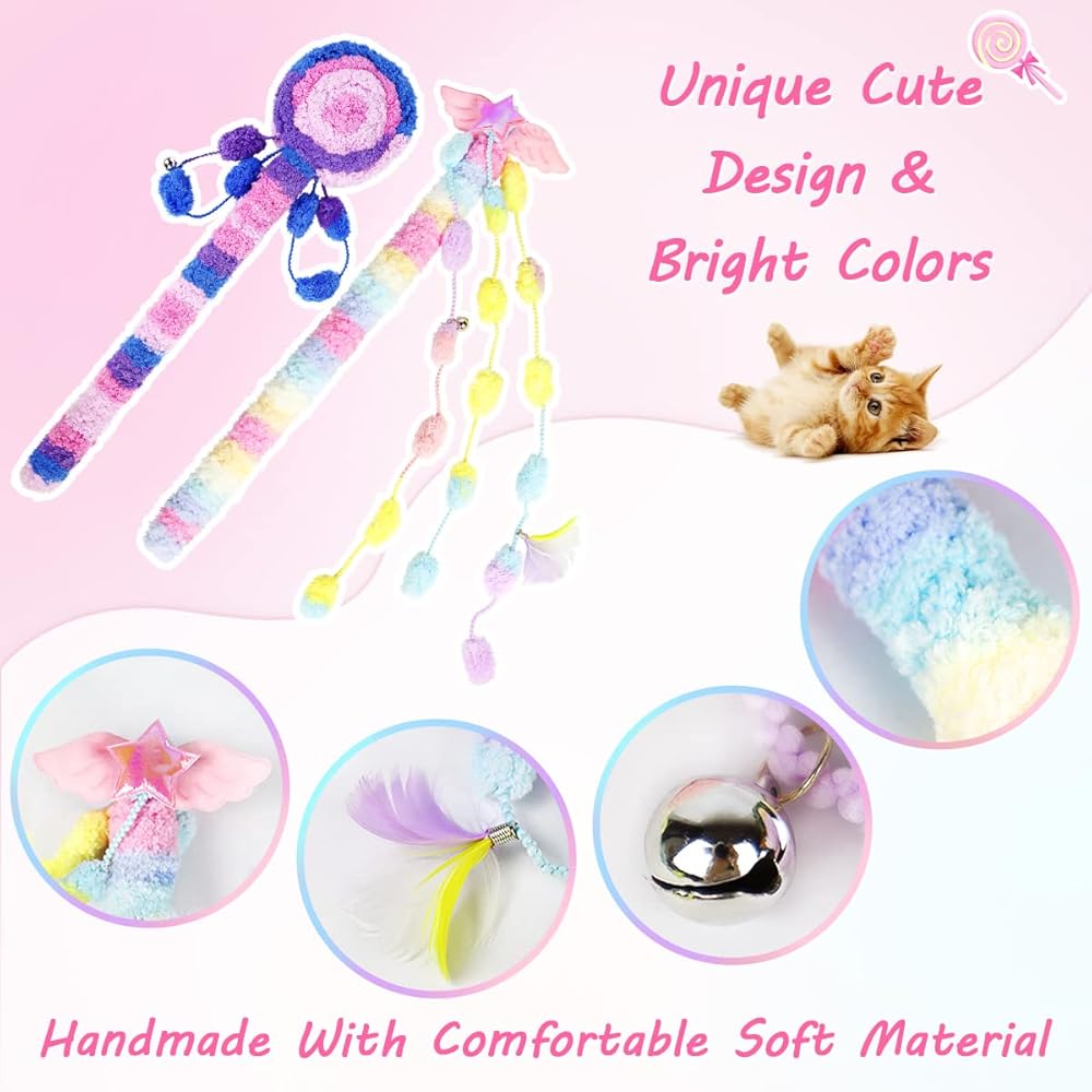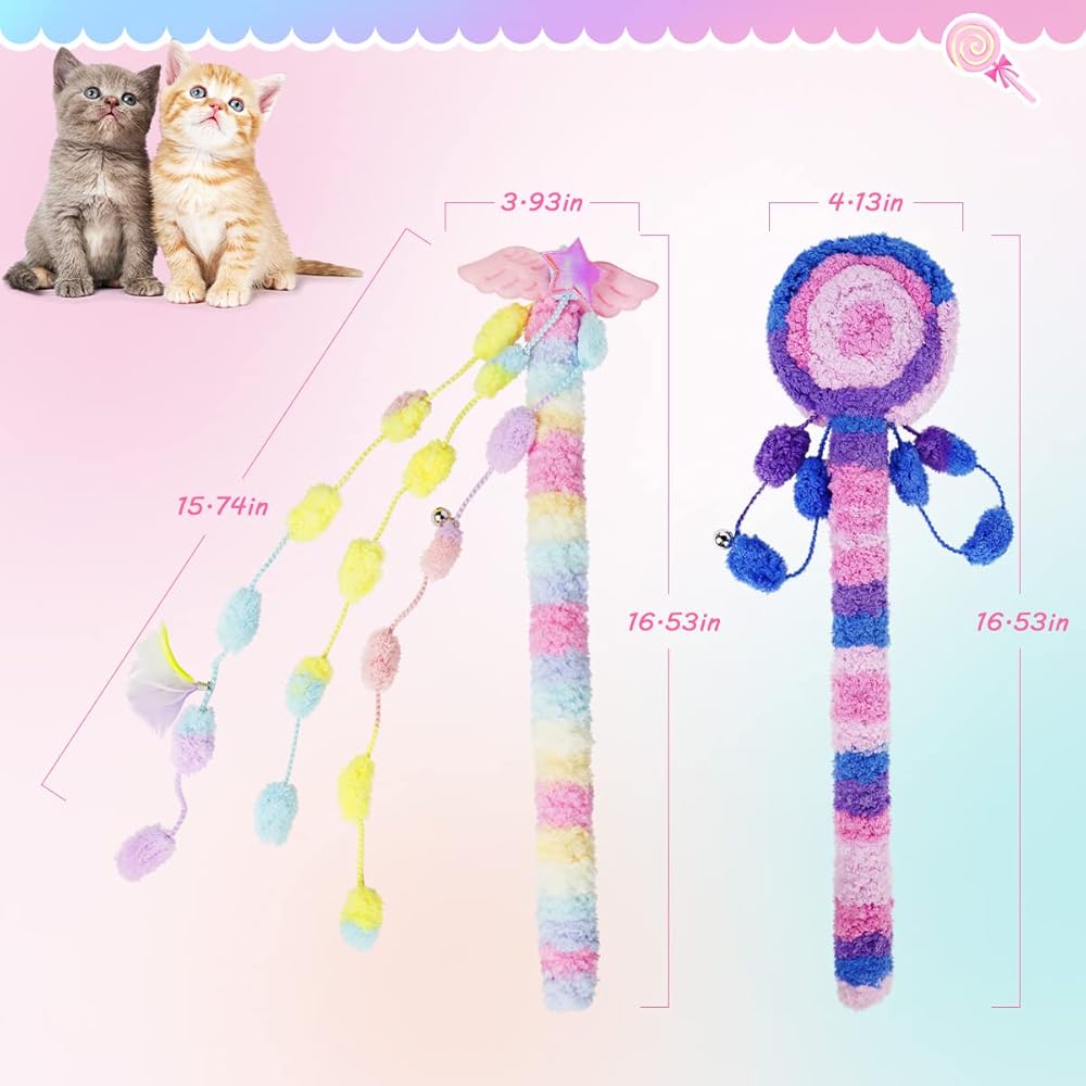 The two soft and cozy cat wand toys are made of natural material that helps to encourage your cats to flip, jump, pounce, chase by playing with them. It also will improve your cat's dental health by providing a soft wand for them to chew to clean their teeth and gums .It is a good toy to build up intimacy with your loved pets when you get home from work ,It can really get your cats exercise. They are Cute and Adorable, the wands are made with bright rainbow colors to attract kittens , by waving it , it is perfect interactive toys to build up bondings with your perts . They are super light and comfortable to hold for long time , it is especially good for you to lie on the couch to play after a long day of work , no need to wave too much or reach out a lot , just play by kitty side ! The sets includes 2 different cat wand toys, a fairy wand and a lollipop, they are perfect for kittens of all ages .