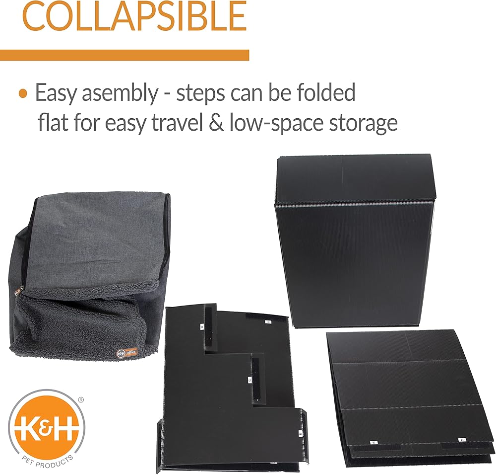 K&H Pet Products Pet Steps are the perfect accessory to help pets step up onto a couch or high bed. Durable pet stair covers are removable and machine washable for easy care. Available in 3-Step and 4-Step configurations to match your furniture's height. These pet stairs unique design is lightweight for easy mobility from room to room. K&H Pet Stairs are collapsible and can be broken down flat for easy travel or low-space storage when not in use. Recommended for small to medium dogs or any size cat (holds up to 50 pounds). Designed by K&H with OVER 20 years of experience in creating safe, innovative, quality products for pets; One year limited warranty.