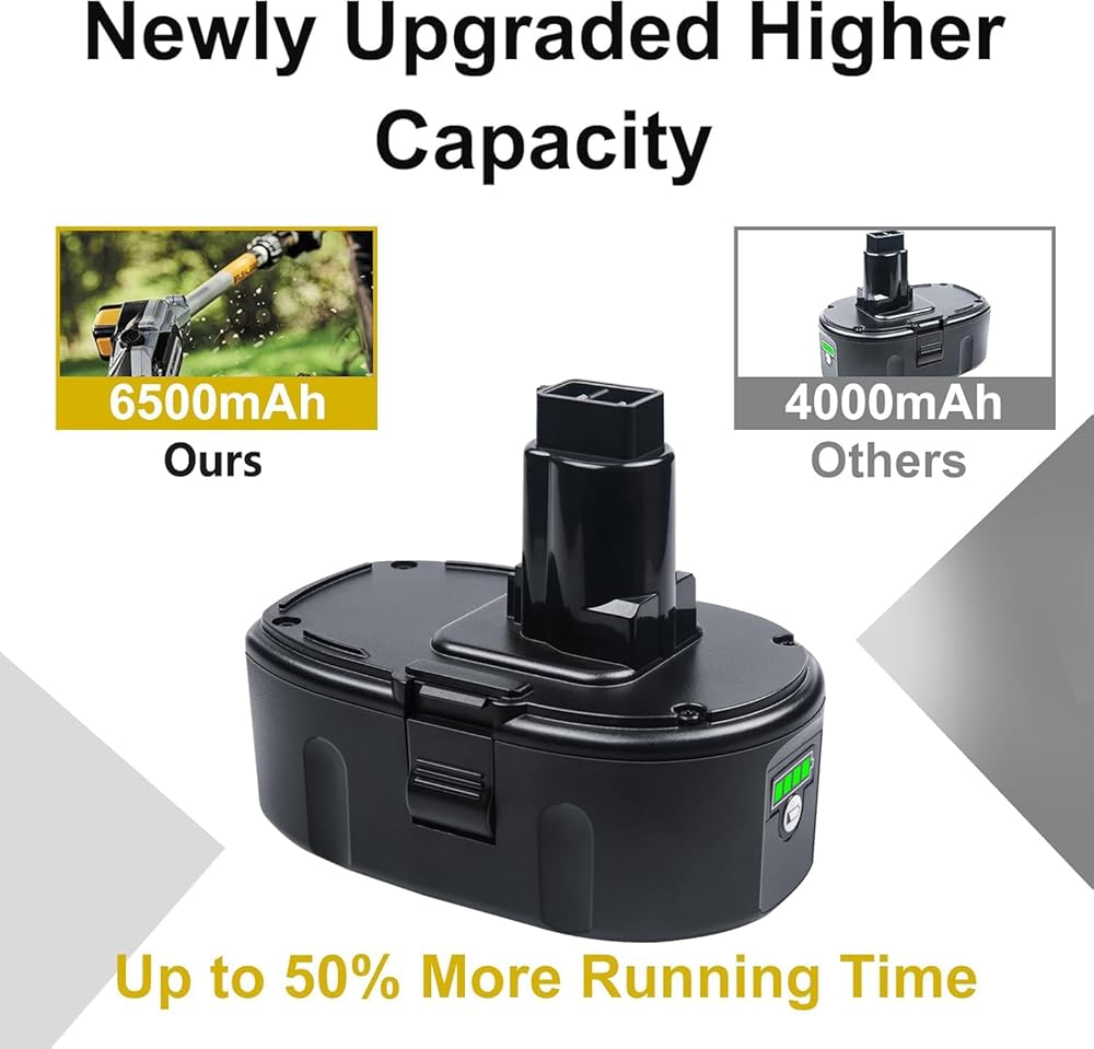 [High Capacity] 6.5Ah 18V lithium battery Replacement for dewalt DC9096 Not only improving capacity, but also the performance. Compare to the original Ni-Cd/Ni-MH 4.5Ah battery, it has no memory effects and running time longer than the Ni-Cd/Ni-MH battery. More powerful and More efficient