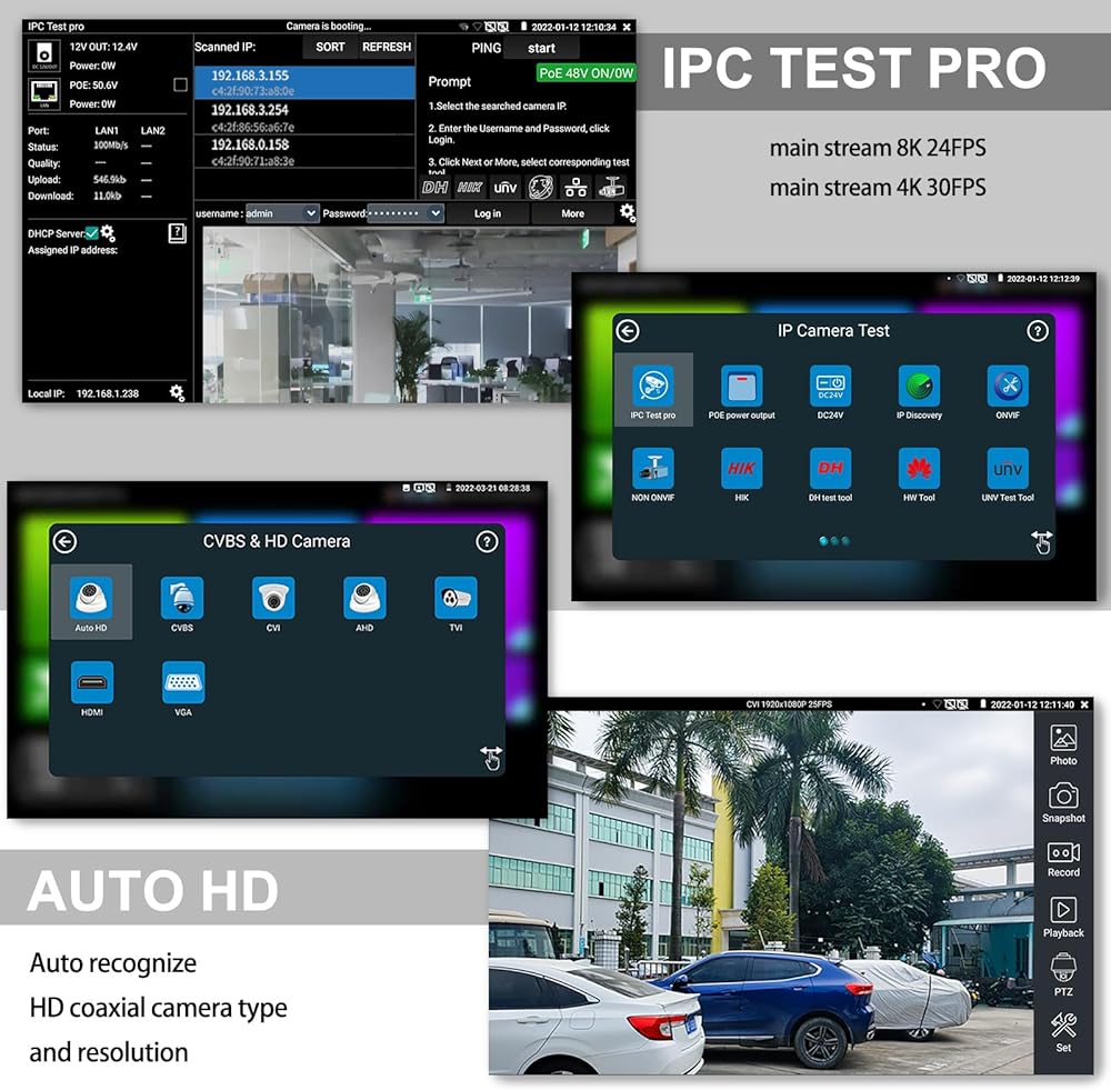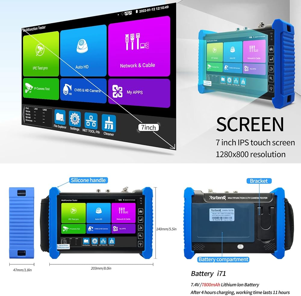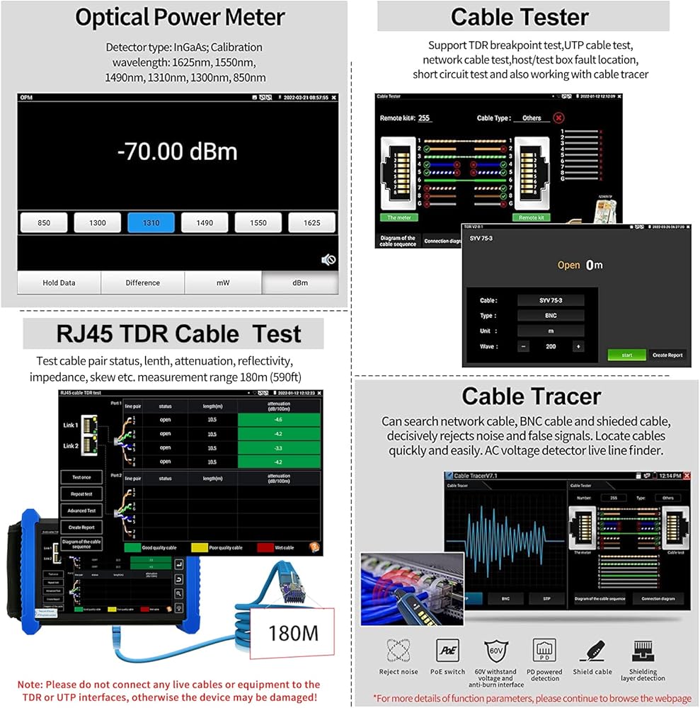 【Upgrade NEW CCTV Camera Tester】Model:IPC-7600COTADHS Plus.All features.7 inch touch screen,1280*800 high resolution,Support Optical power meter,Cable tracer,TDR cable test. 8K IPC test,Dual Gigabit Ethernet 10/100/1000M Ports,2.4Ghz WiFi(Not 5G),POE,RS485,TF card slot(8GB TF card included).HDMI I/O,VGA input, Audio I/O.Use Android 9.1 OS.connect to the network to upgrade the APP.The camera tester tool will make your installation process simple and efficient.