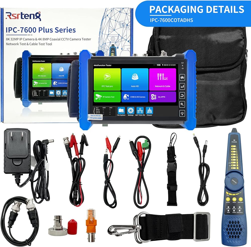 Rsrteng CCTV Tester,IPC-7600COTADHS Plus 8K 32MP IP Camera Test with Cable Tracer 4K 8MP AHD CVI TVI SDI CVBS Test HD Tester 7"Touch Screen Monitor Support VGA TDR WiFi Audio POE RS485