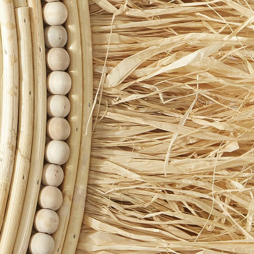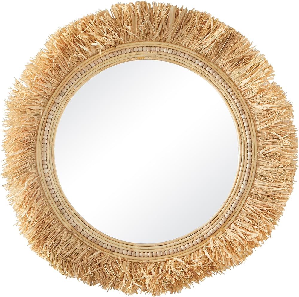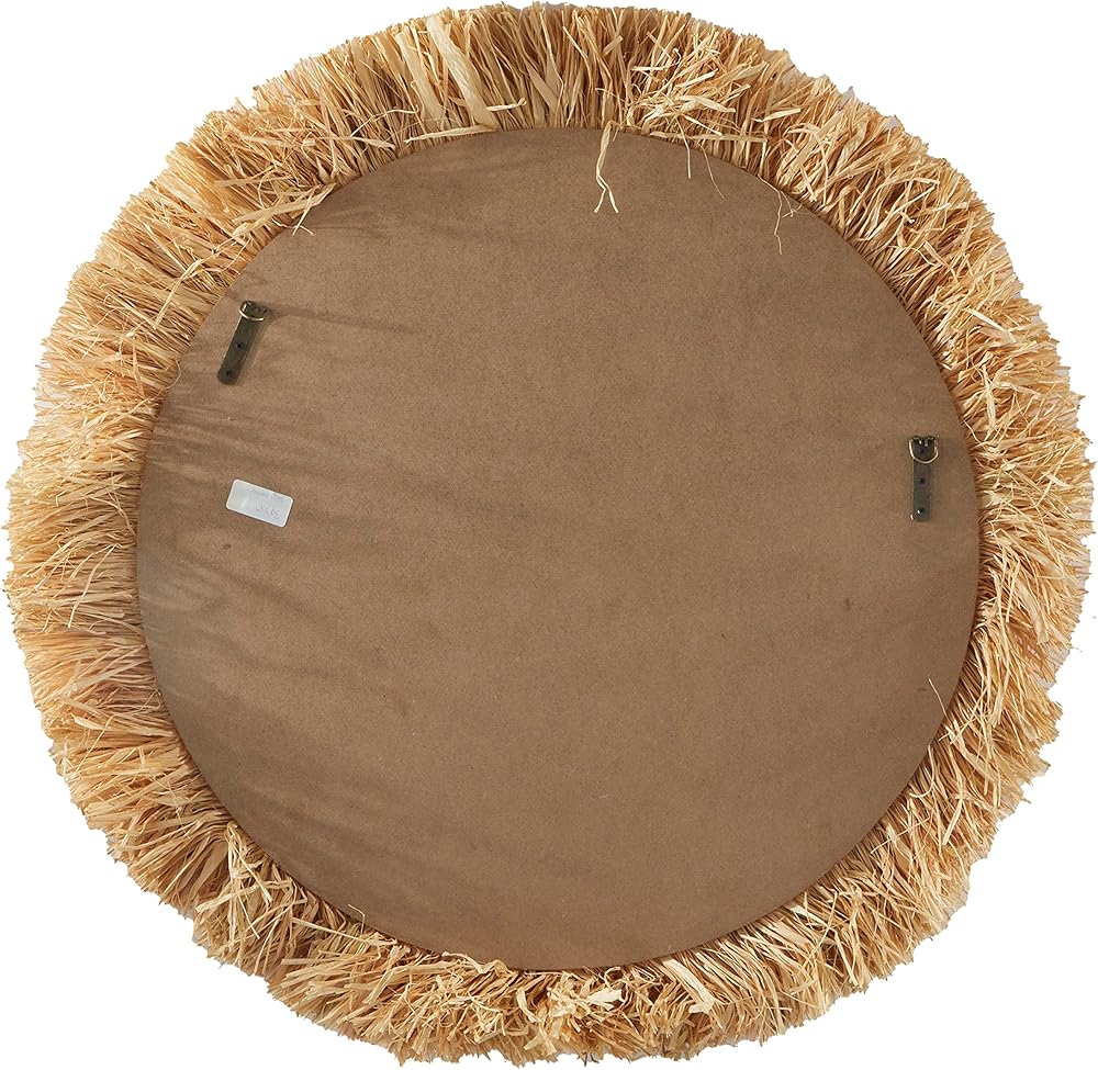 FEATURES ROUND FRINGE WALL MIRROR: Brown wall accent features a reflective round mirror adorn with curve border with orb accent and complemented with a voluminous straw fringe outer layer