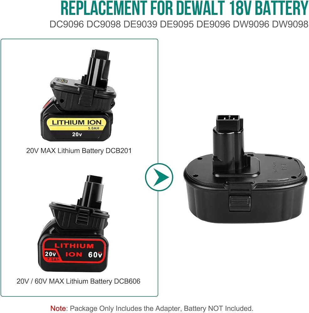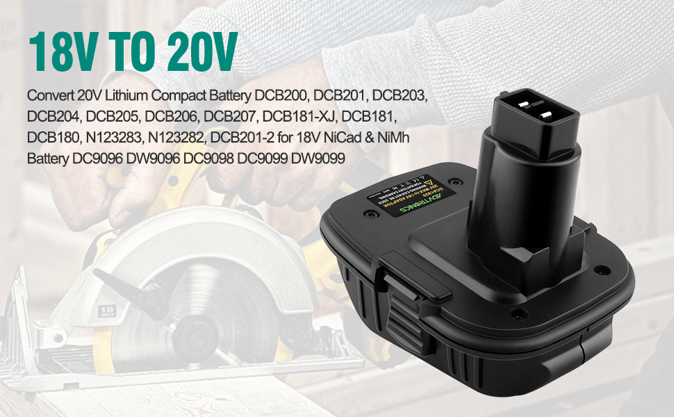 This DCA1820 adapter is designed for use 20v MAX lithium battery running older 18V tools. Replace 18V Ni-Cad batteries, DC9096 DC9098 DE9039 DE9095 DE9096 DE9098 DW9095 DW9096 DW9098.