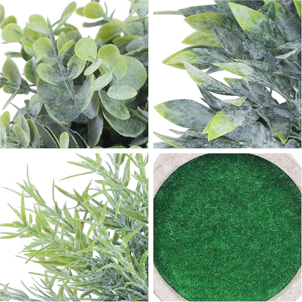 • 【Package】You will get 3 packs faux plants that includes artificial eucalyptus, boxwood and rosemary. Each small fake plant comes already set in its own paper pulp pot for easy displaying.