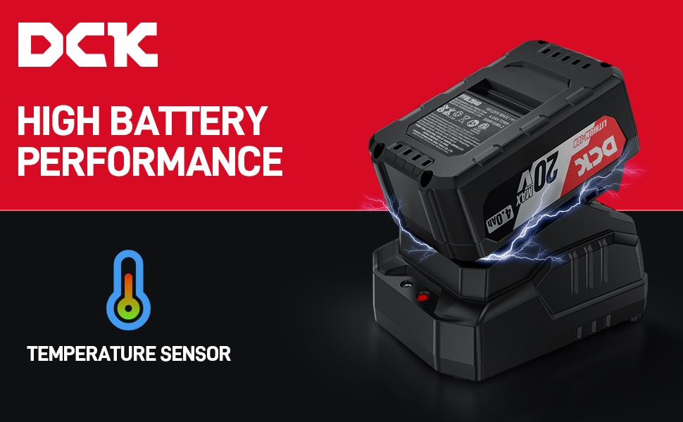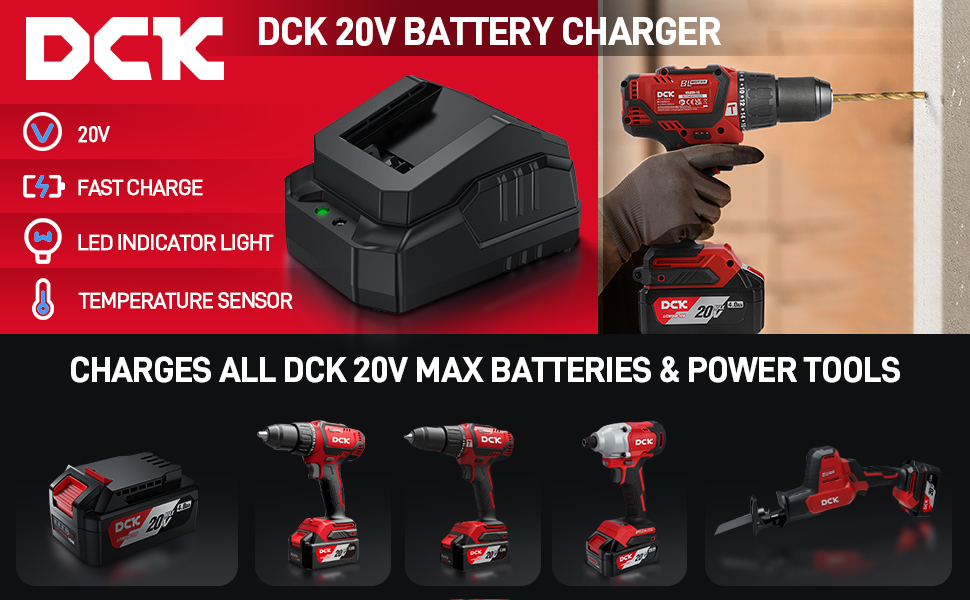 [Compatible with DCK 20V Battery & Power Tools] The portable charger is specially designed for DCK cordless power tools battery. Compatible with all DCK 20V max batteries and power tools, it extends battery life, charges all DCK 20v max batteries, and keeps tools powered. Highly compatible charger, more convenient for charging brushless hammer drill.