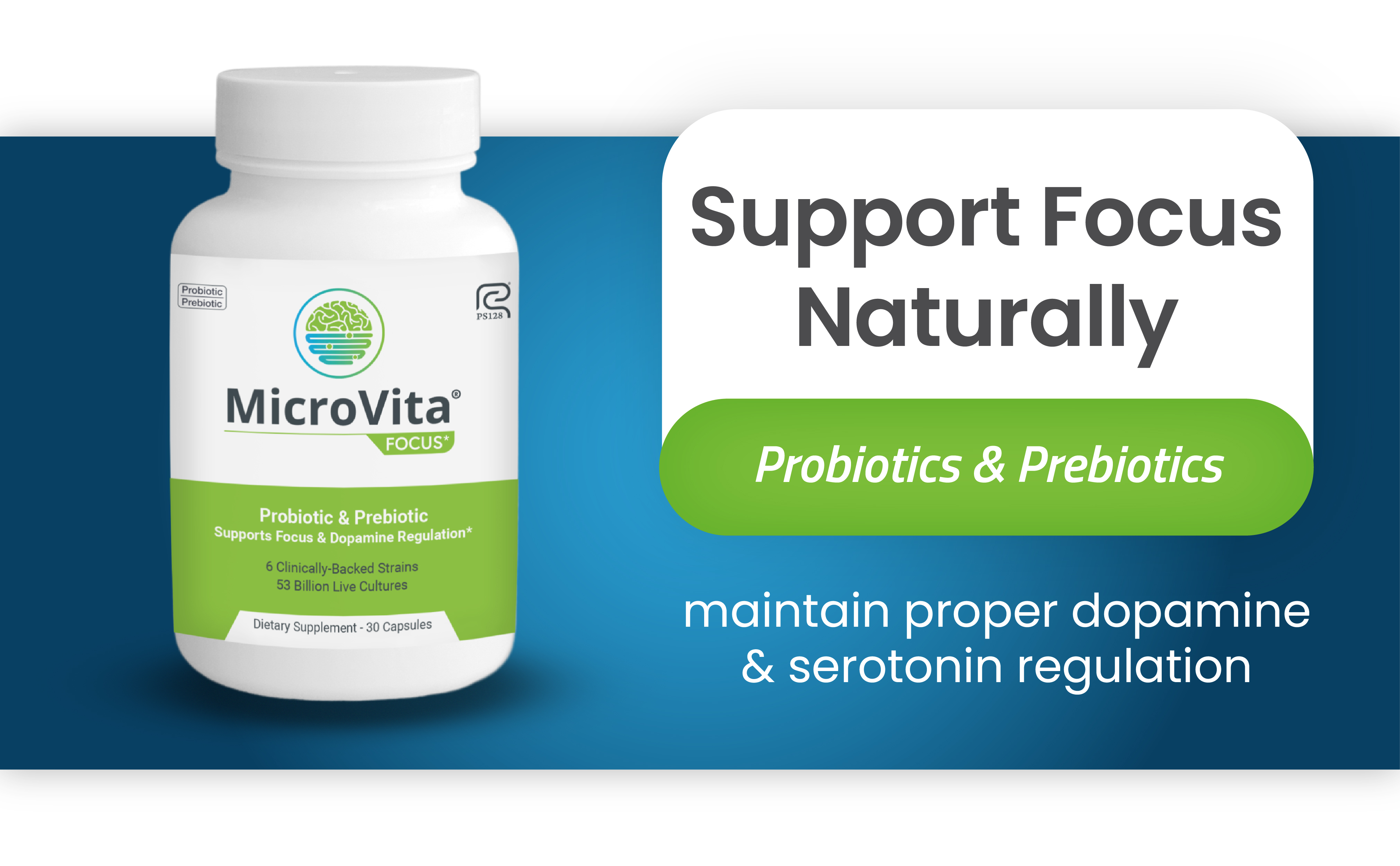 Support Focus & Gut Health: MicroVita Focus is a probiotic & prebiotic blend designed to promote focus, attention, and healthy gut function while supporting proper dopamine regulation.