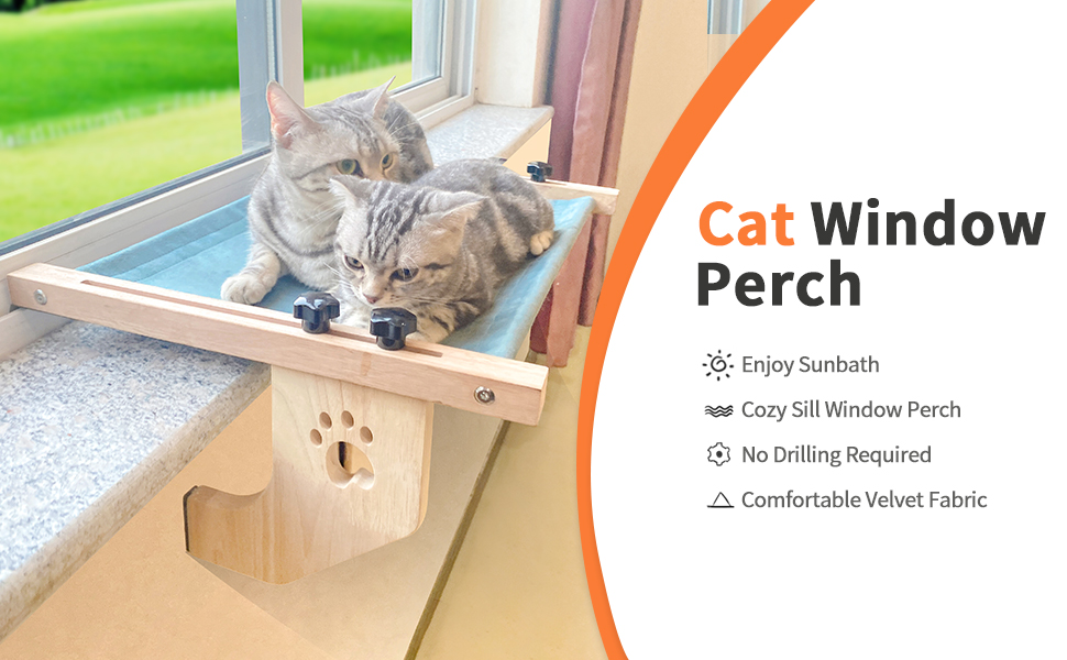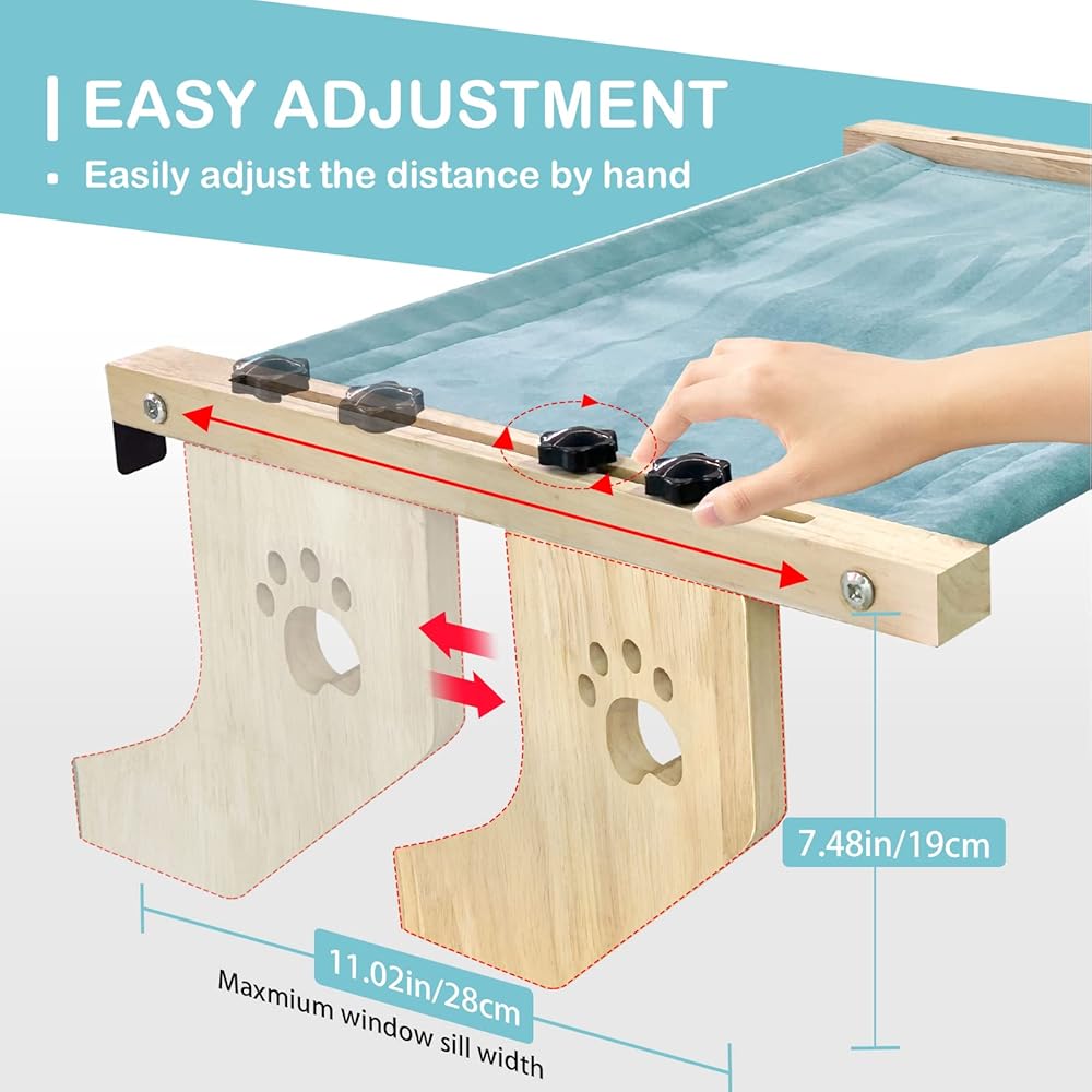 🦅【SIMPLE ASSEMBLLY & ADJUSTMENT】The assembly of this cat window hammock is easy that only a few steps are taken to set it up. After the assembly is complete, you just need to screw the thumb screws to adjust the distance between hooks and supports to fit the thickness of your window sill. Avoid the hassle of twisting the screws with a wrench for each time.