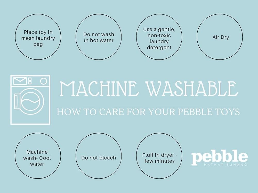 Machine Washable: For best results, place your Pebble toy in a mesh bag and launder with cool water and non-toxic detergent. Fluff in the dryer for a few minutes and then air dry.