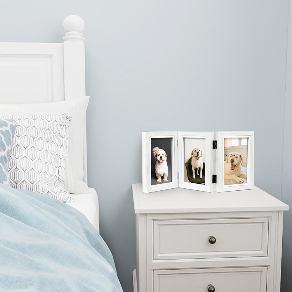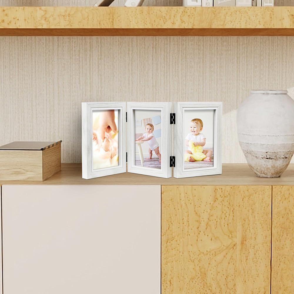 【Foldable picture frame】Hold Three picture frames 4x6 vertical photos for desktop display.