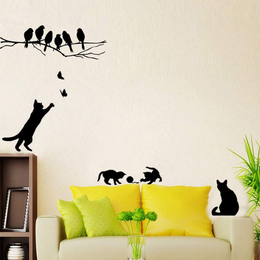 2 Sets Wall Decor Stickers, Black Cat and Tree Branches Birds Wall Art Decals, DIY Wallpaper Mural Home Decoration for Living Room, Bedroom, Farmhouse Decor