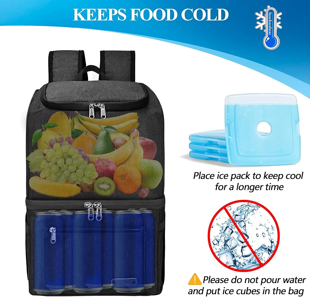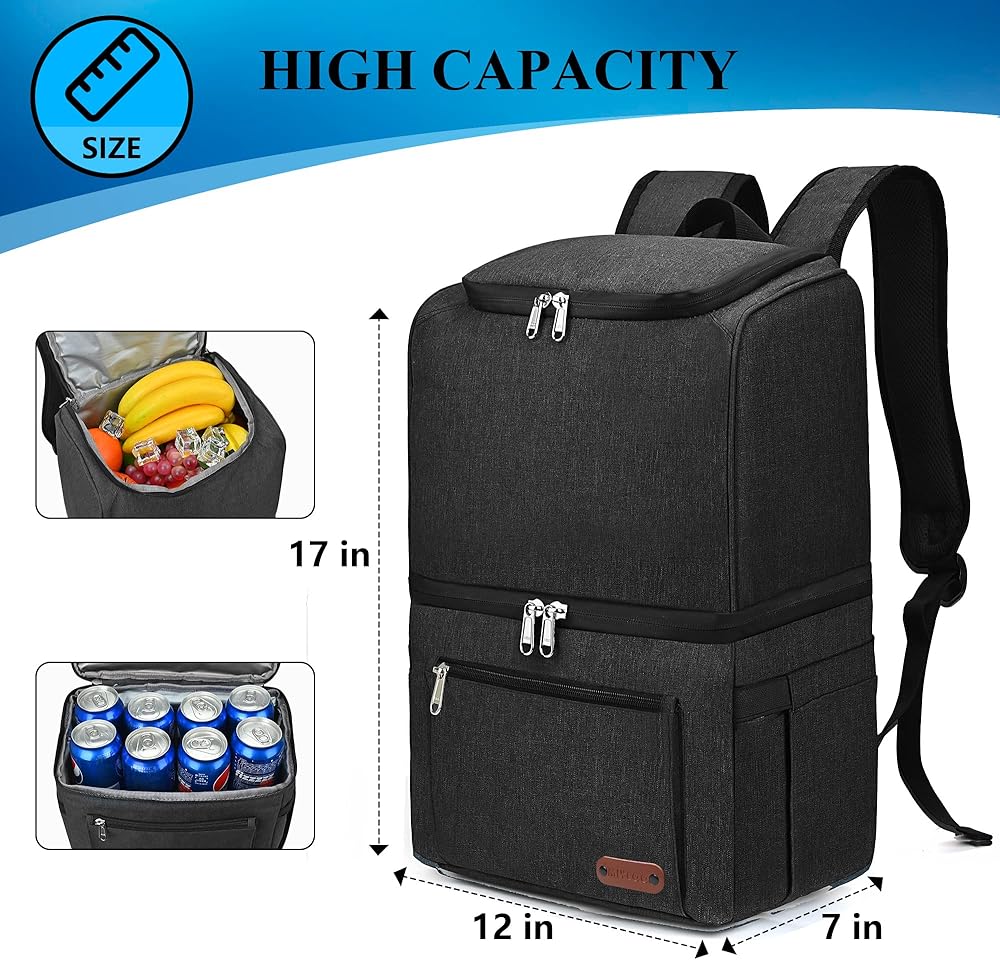 【Large Capacity Multiple Pockets】 Double deck backpack cooler(17*12*7 inches, 35cans*330ml/25 liters) designed to maximize storage efficiency. Weight: 1.5 lbs/0.6kg. This backpack cooler has 2 large main storage compartments, one for insulation and one for refrigeration, two side pockets for insulated cups, 2 zippered pockets for additional storage of other items, and a front pocket for cell phone or power storage. There is also a top pocket for storing utensils.