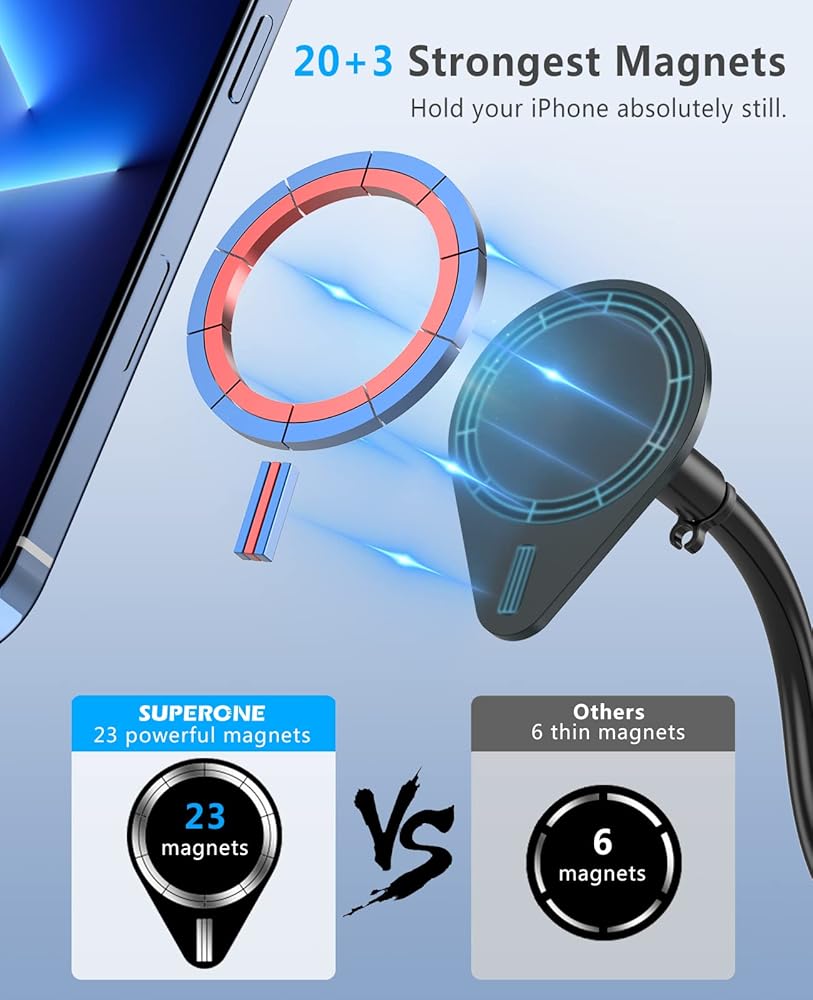 Upgraded MagSafe Version: This gooseneck phone holder is compatible with iPhone 15/ 15 Pro/ 15 Pro Max/ 15 Plus, 14/13/12 Series and MagSafe cases and All Phones. The amazing magnetic technology can be directly compatible with them. No need to stick any metal plates! (we provide extra 1 metal rings, fits case and other phones without MagSafe).