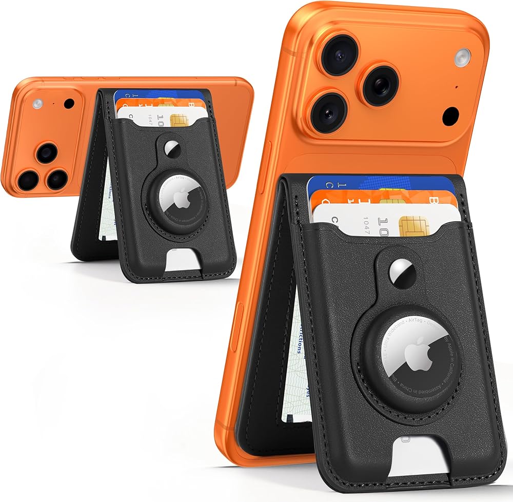 HiWe for Magsafe Wallet Stand with Airtag Holder, Strongest Magnetic Wallet for iPhone 17/16/15/14/13/12 Series, 6 Cards Holder, ID Window, Leather RFID, 3 Slots, Black