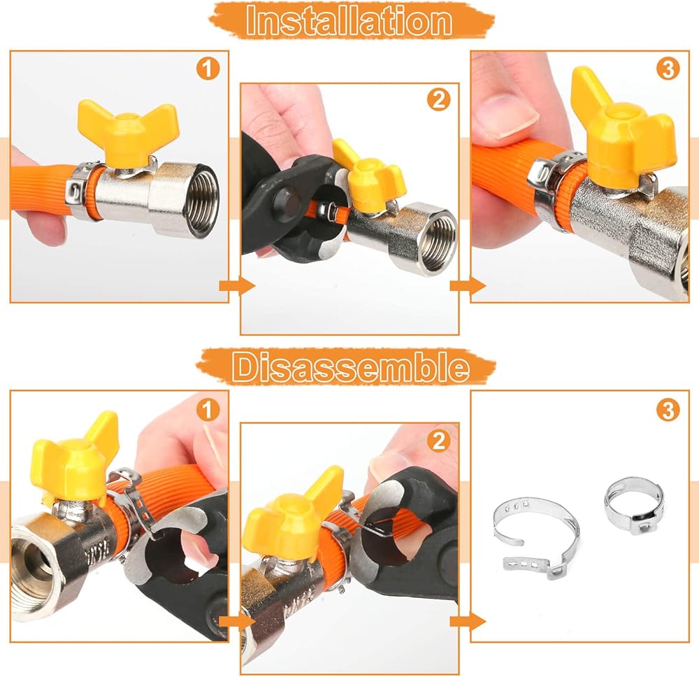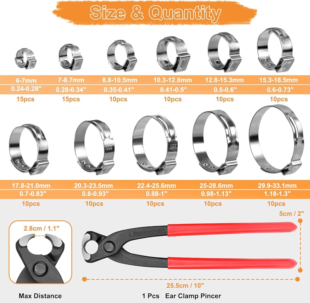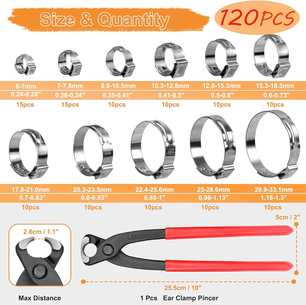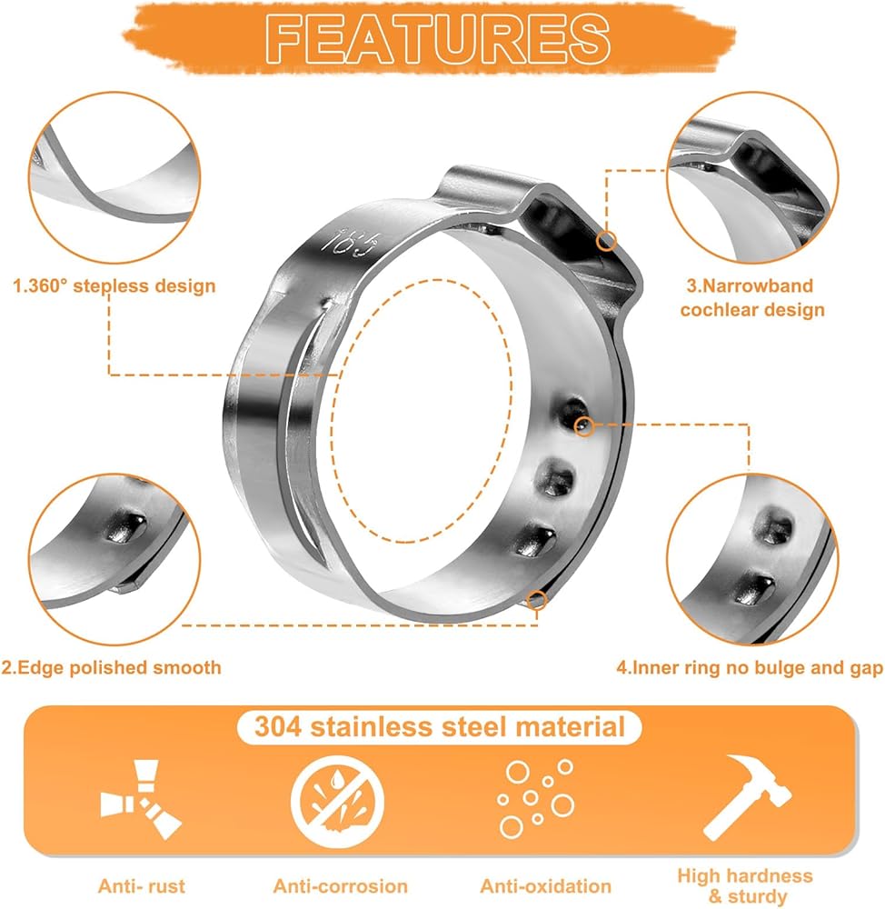 ✅[𝟑𝟔𝟎°𝐒𝐭𝐞𝐩𝐥𝐞𝐬𝐬 𝐒𝐞𝐚𝐥] Narrow band design providing a more concentrated sealing pressure. The edge of all stepless ear clamps are polished smooth, not damage the hose. Perfect seal and no skin catching metal sticking up.