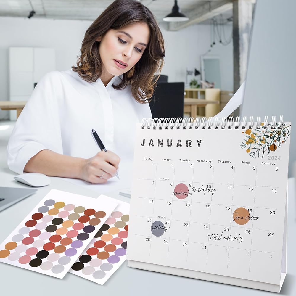 Quality Guarantee: Made of extra-thick, high-quality paper for clear writing and to prevent annoying ink bleed-through. Sturdy backing for a sturdy surface and sturdy double-wire binding for a smooth page turning experience. 2 sheets of 96 round stickers for better marking. Lbylyhxc's desktop monthly calendar.