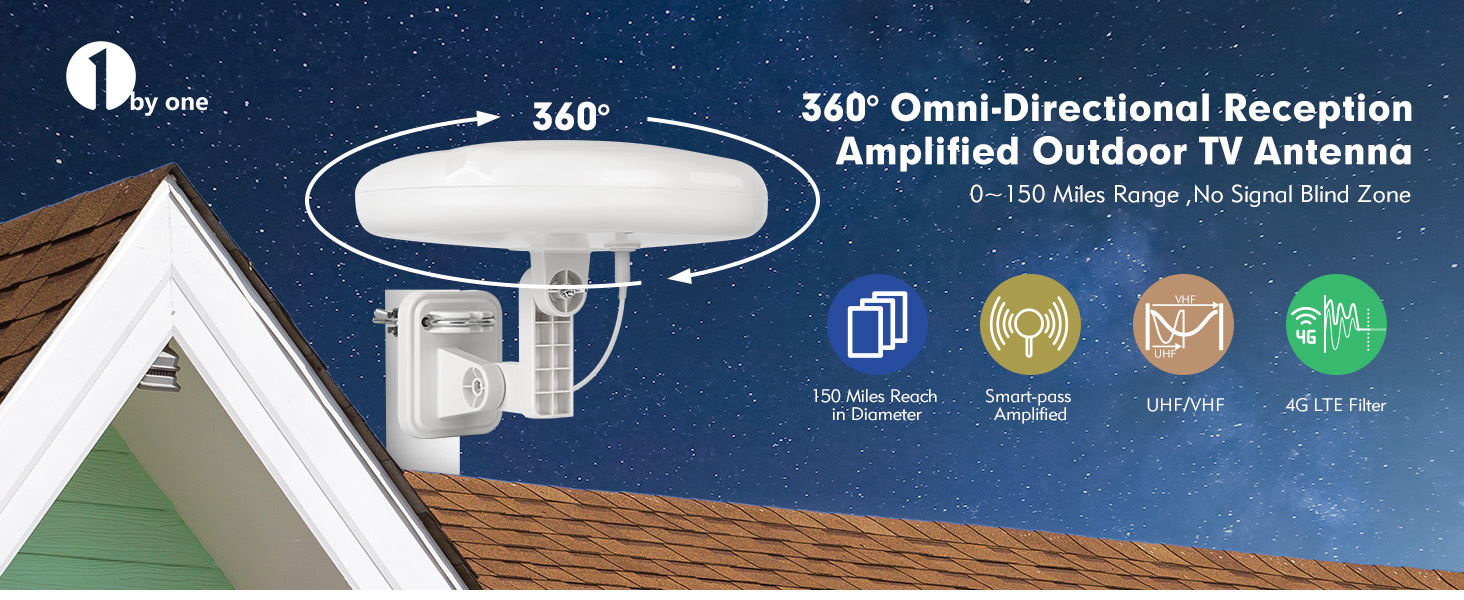 1byone Outdoor TV Antenna 360° Omni-Directional Reception Long 100+ Miles Range Enhance VHF&UHF 4K Ready HDTV Antenna with Added Stability for Outdoor/Attic/RV Use - 39ft RG6 Coax Cable