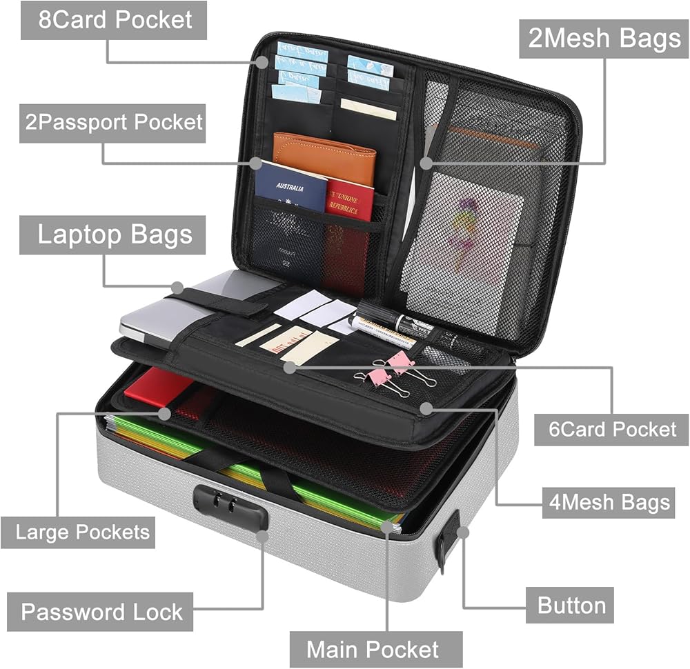 【Sufficient Capacity, Excellent Structural Design】: 15 * 11.5 * 4 inches. It can accommodate various A3/A4 sized documents. The document bag features internal partitions, numerous compartments, and a four-point security strap for storing laptops. This organizer allows you to easily keep all your important documents together and ensures their safety.