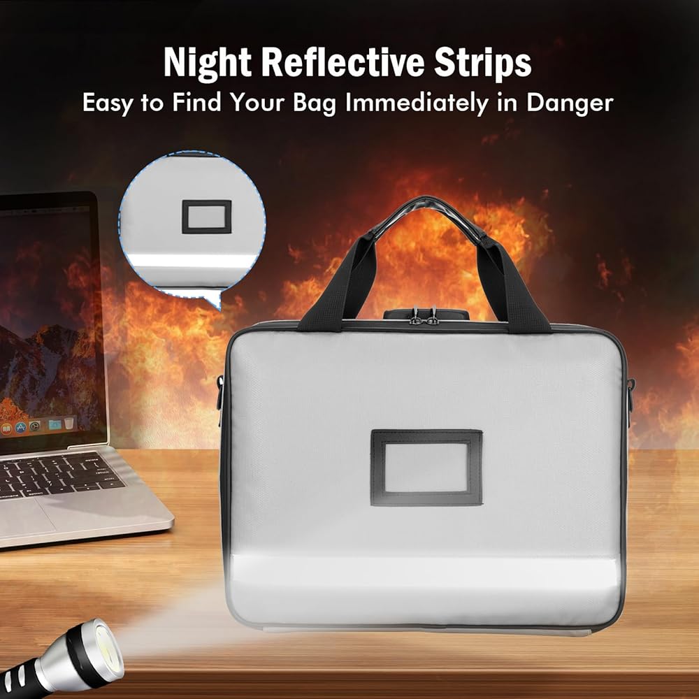 【Reflective Tape Design】:This fireproof document safe bag features reflective tape that allows you to quickly locate the bag for evacuation in emergency nighttime situations.