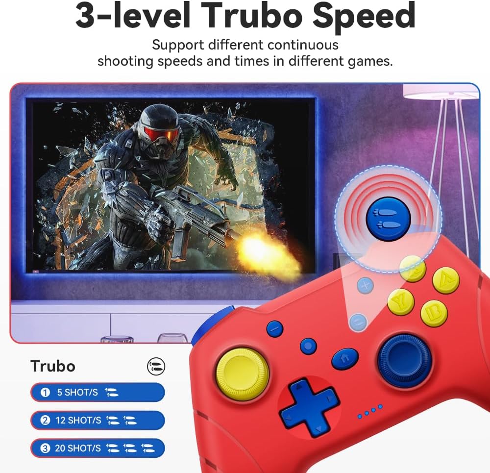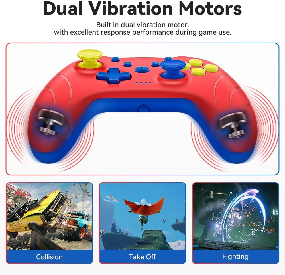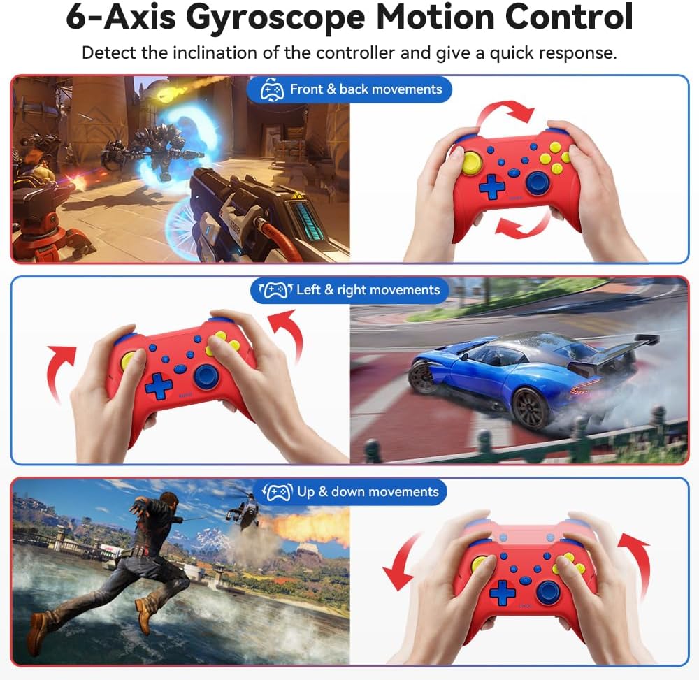 【Ergonomic Design Switch Controller】 This switch controller has an ergonomic design, which better adapts to the structure of the hand and reduced response time and improved accuracy at critical moments. The handle has anti-slip and anti-sweat material, skin-friendly touch is comfortable for long time hand grip, you will not feel tired and improve game experience