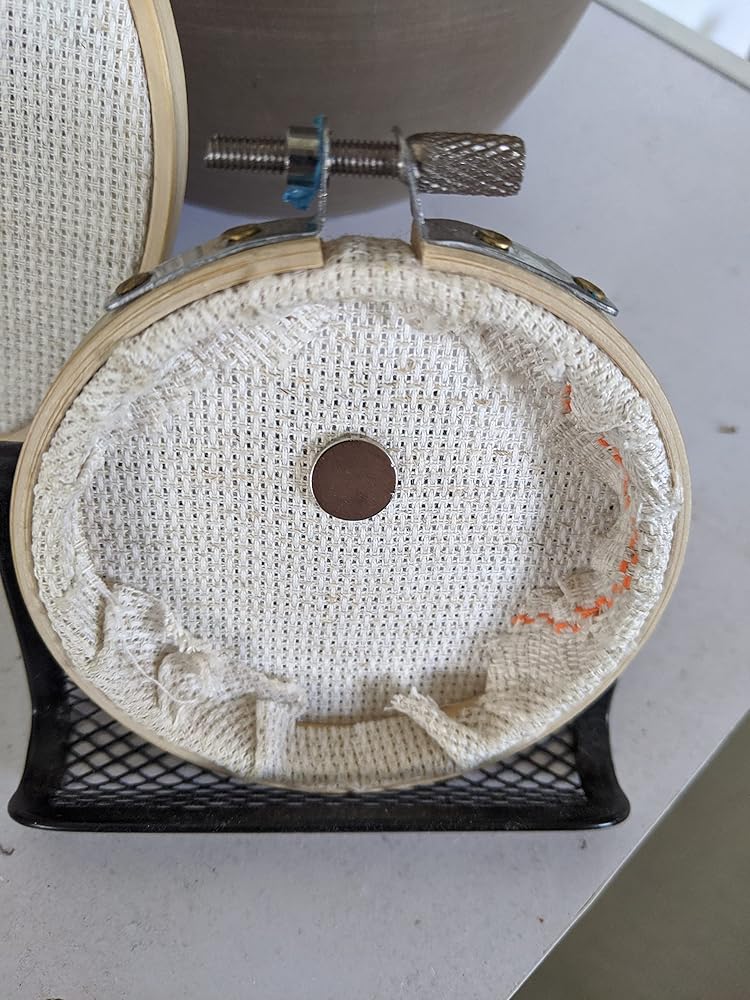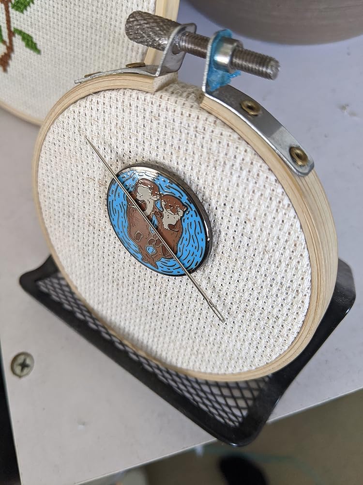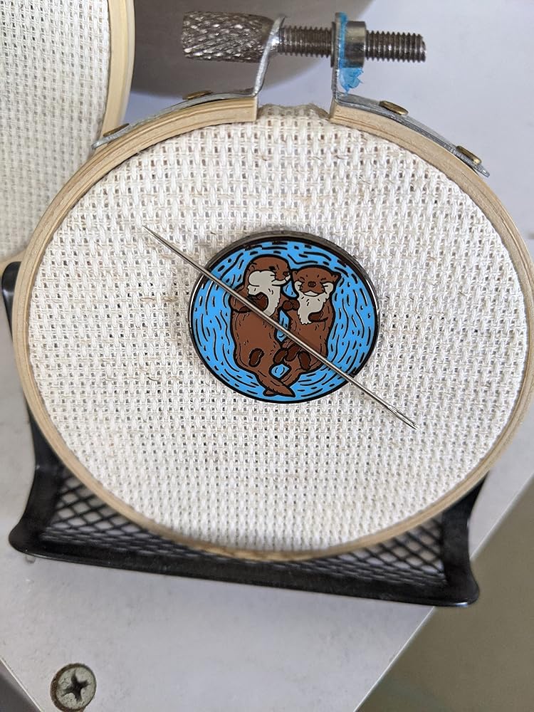 Otters Needle Minder One of the most adorable facts in the animal world is that otters will hold hands with each other so that they don't drift apart while they sleep. Well now you can have your own little otter pair holding hands and holding your needle. Shown on a 3" embroidery hoop. The needle minder comes with two magnets, one attached to the back, and one to hold it down onto your fabric from the back. Simply chuck your needle down whenever you need to take a break and the magnet will hold it down for you. The best way to ensure that your magnets last is by sliding them apart rather than pulling or slamming together, this ensures that they won't break :) Given the nature of the magnets please take extra care around small children as these can become incredibly dangerous if swallowed.