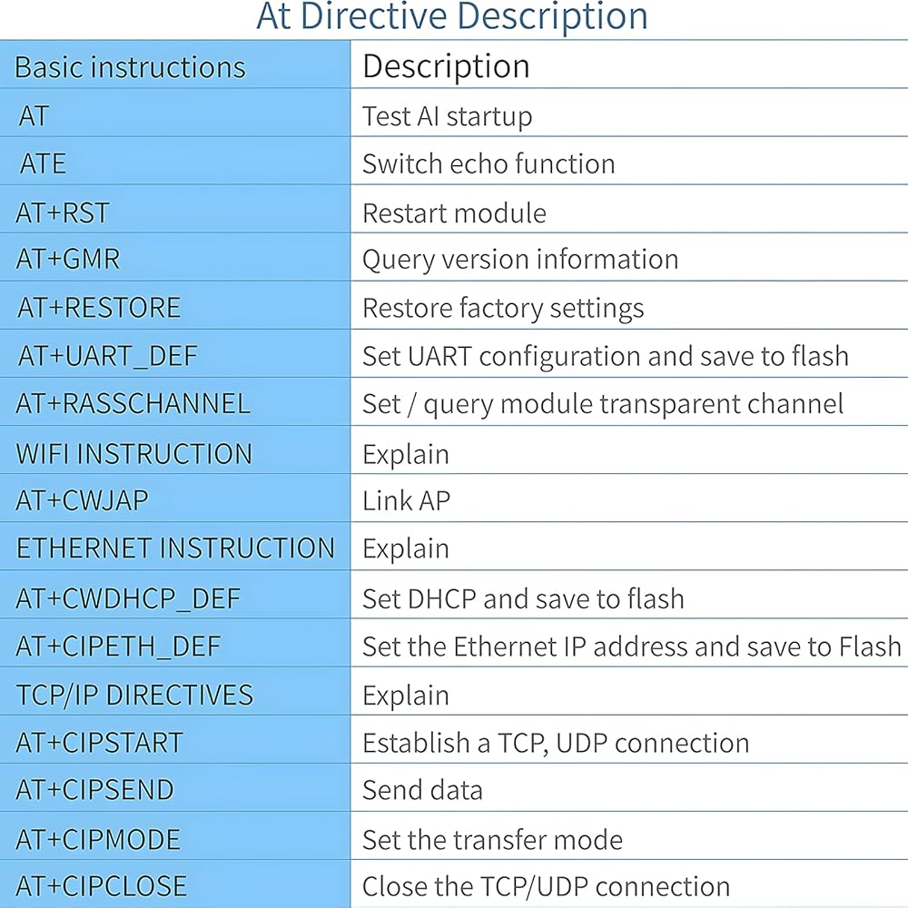 Five functions:①Socket function (Socket working mode is divided into four types: TCP Client, TCP Server,UDP Client, and UDP Server, which can be set by AT commands)②Serial port function③Bluetooth function④Wifi function⑤Wired network port access function(Development board is connected to the Internet or local area network through a wired network,Socket function can be configured through AT commands, a TCP/UDP connection can be established, and the user's designated server can be accessed)