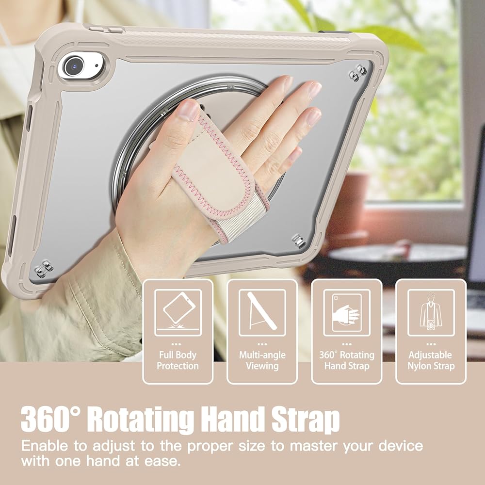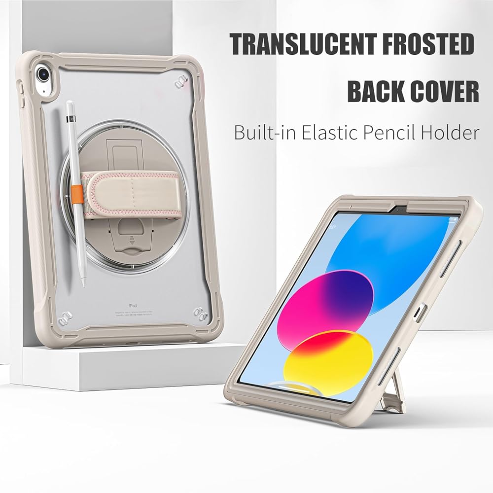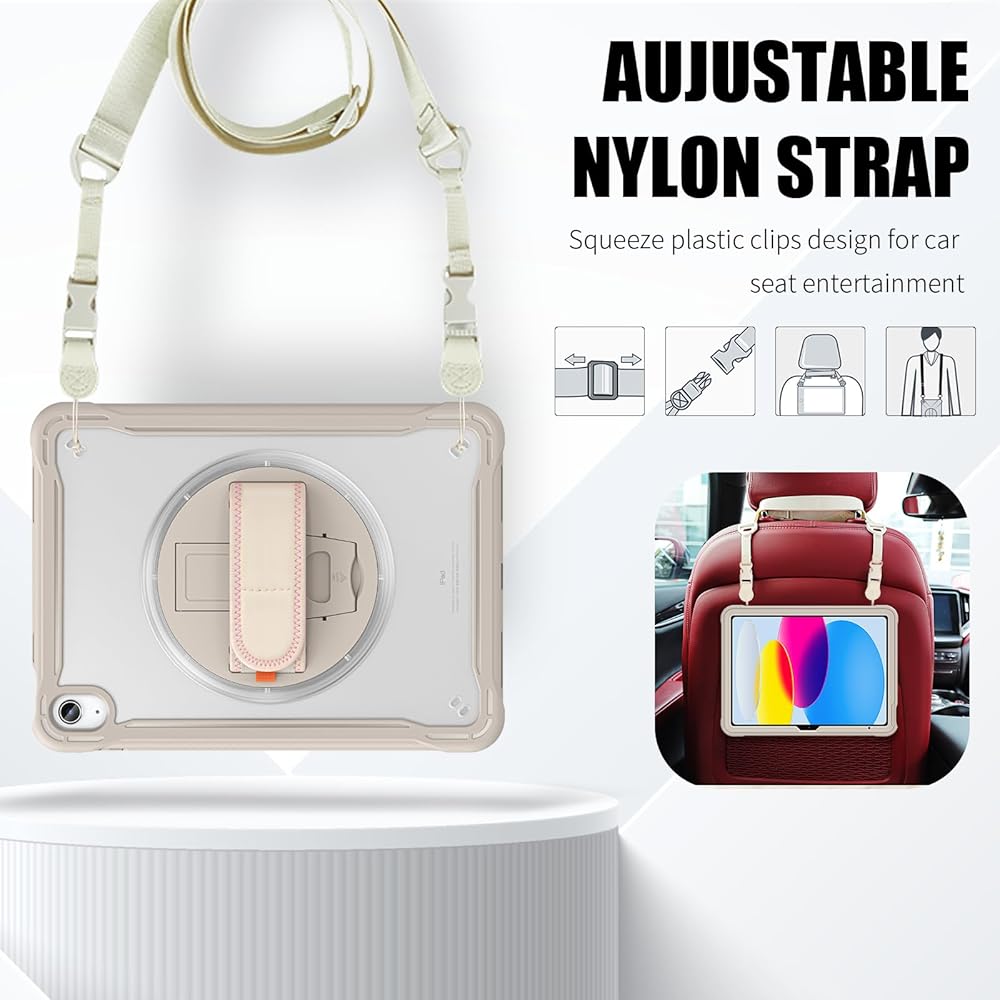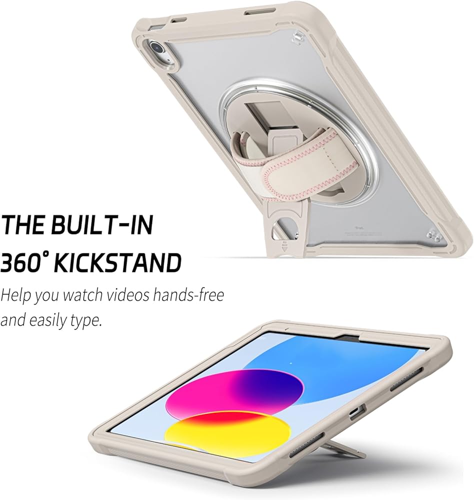 𝐀𝐝𝐣𝐮𝐬𝐭𝐚𝐛𝐥𝐞 𝐇𝐚𝐧𝐝 𝐒𝐭𝐫𝐚𝐩 & 𝐏𝐨𝐫𝐭𝐚𝐛𝐥𝐞 𝐒𝐡𝐨𝐮𝐥𝐝𝐞𝐫 𝐒𝐭𝐫𝐚𝐩 & 𝐑𝐨𝐭𝐚𝐭𝐢𝐧𝐠 𝐒𝐭𝐚𝐧𝐝: Provide the protection and convenience when you play or work with iPad. Hang it anywhere for your entertainment, makes you using 𝐢𝐏𝐚𝐝 𝟏𝟎𝐭𝐡 𝐆𝐞𝐧𝐞𝐫𝐚𝐭𝐢𝐨𝐧 𝐜𝐚𝐬𝐞 easily. 360 Degrees rotating Kickstand provides convenient viewing, with soft strap, easy to use your 10th gen iPad in your outdoor travelling, working, gaming with kids.