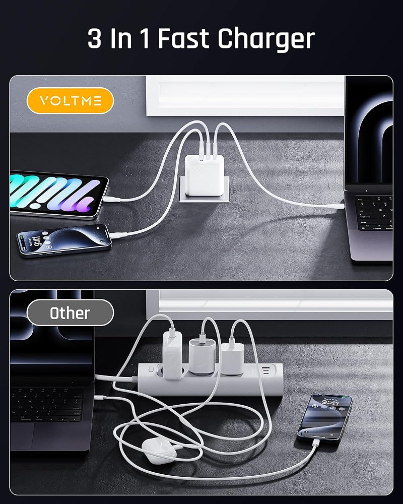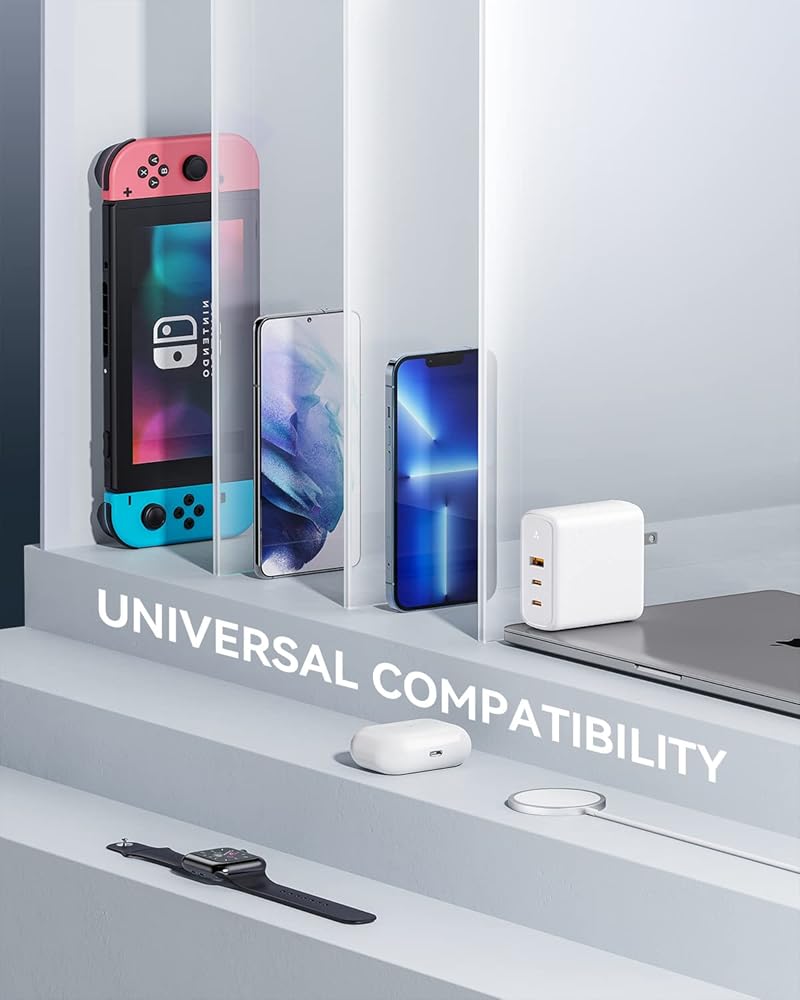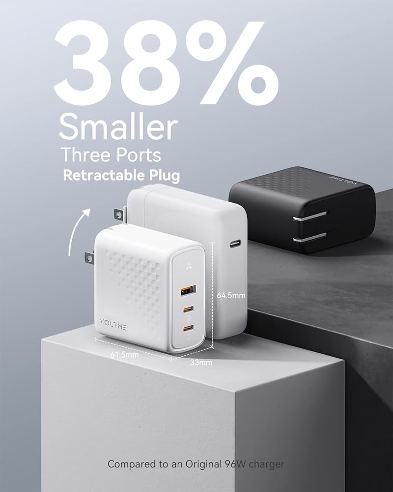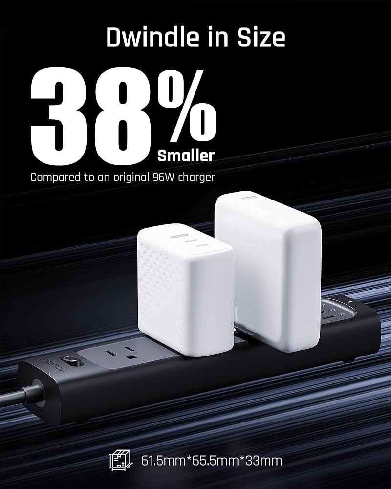 تصميم محمول صغير الحجم: يمكنك تشغيل ما يصل إلى 3 أجهزة بنسبة 38% أصغر من شاحن USB-C الأصلي بقدرة 96 وات مع منفذ واحد. تم تجهيز مجموعة الشاحن هذه بمحول طاقة 2X USB-C وUSB-A مع قابس قابل للطي؛ مثالية للسفر والمنزل والمكتب.