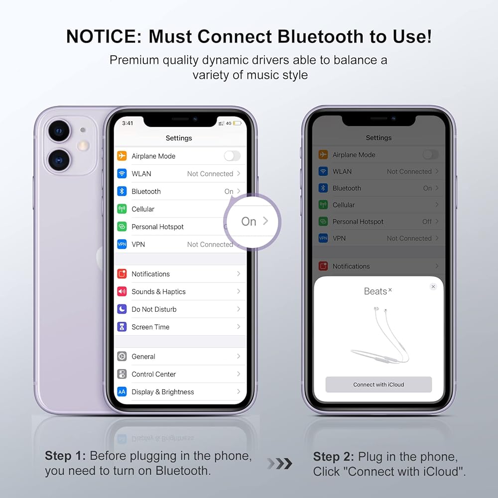 【Connection Method】This wired earphone has been upgraded in connection. Method ①: After inserting the earphone, click "Connect to iCloud" in the pop-up window to use it. | Method ②: Open Bluetooth and find the "Baets" device to connect. When next time you use the earphone again, it will automatically connect to your device in 2-9 seconds. NOTE: This is very important, it is the first step that must done.