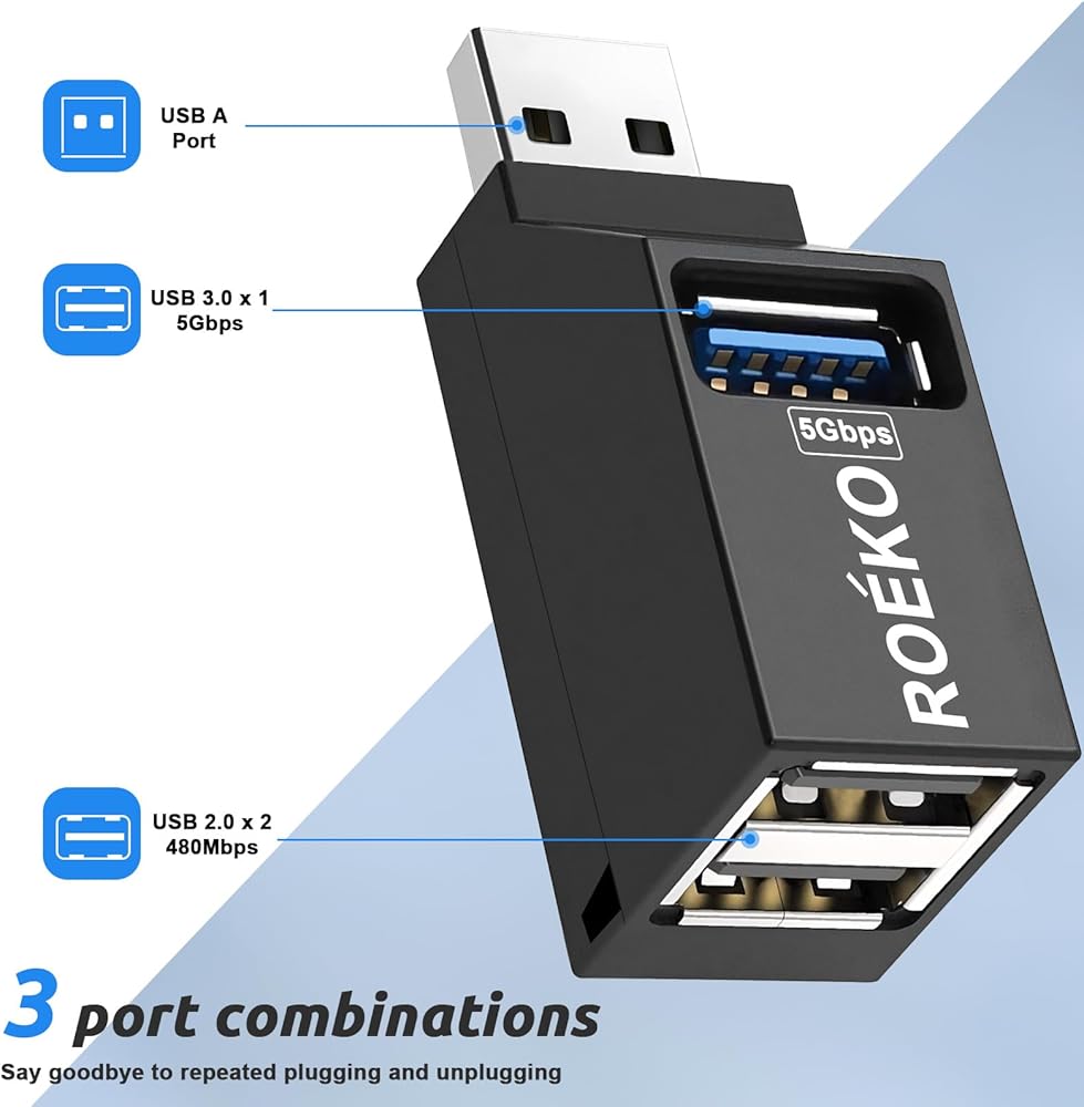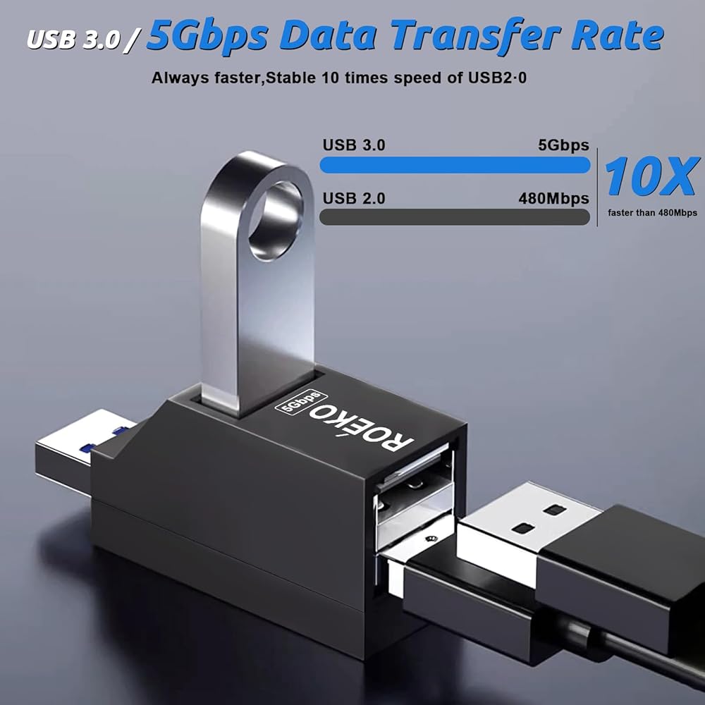 【Multi port USB Hub Expander】& The ROÉKO USB hub adapter comes with one USB 3.0 and two USB 2.0 ports, connected to a USB output port. The 3.0 port can synchronize data at a speed of up to 5Gbps (USB 3.0),and is compatible with 2.0/1.0. It is fast enough to transfer an HD movie in seconds.