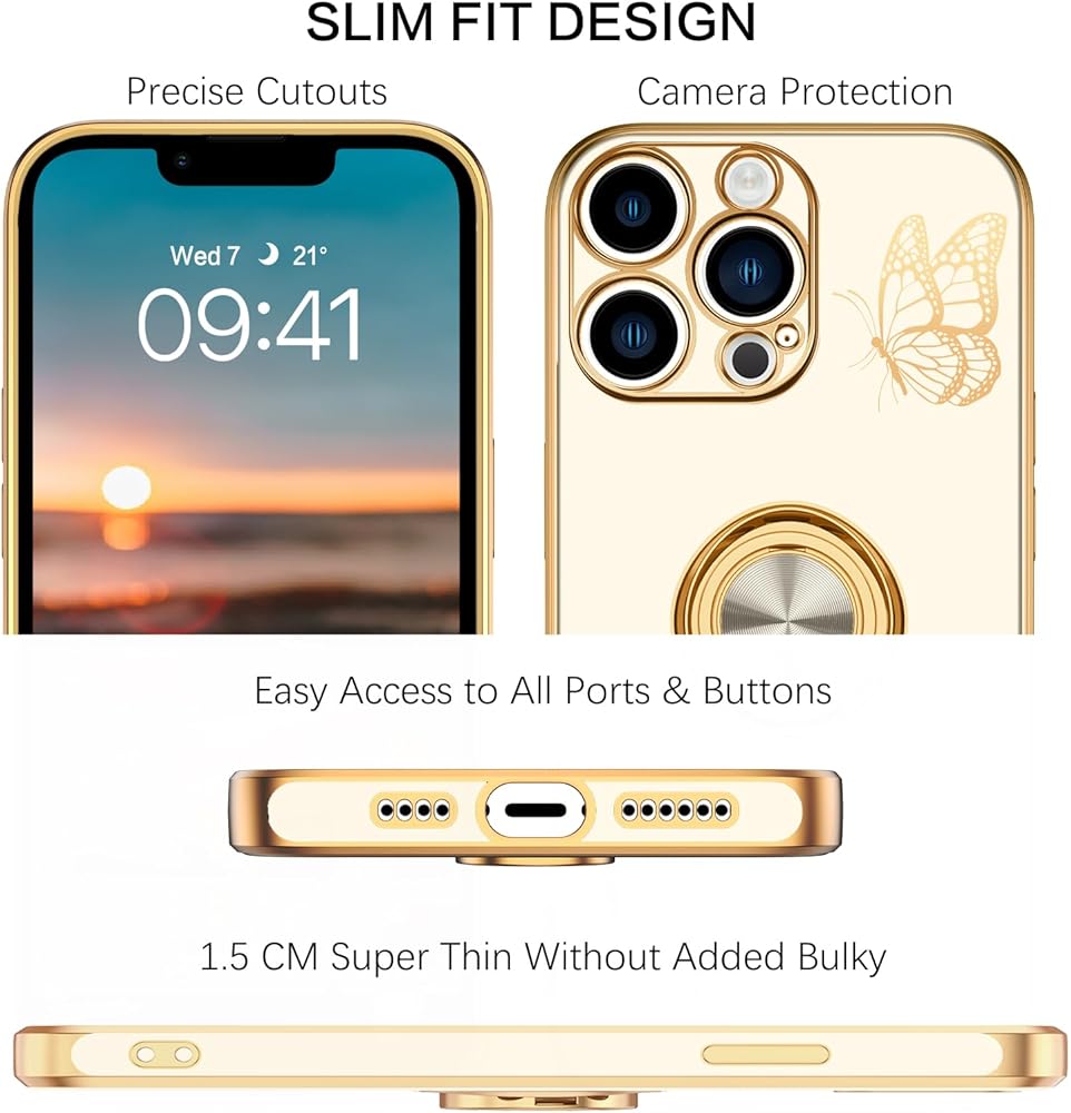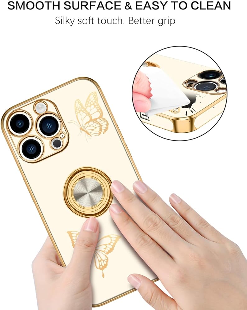 BENTOBEN for iPhone 12 Pro Max Case, Phone Case iPhone 12 ProMax, Slim Fit Butterfly Design Kickstand Ring Holder Shockproof Protection Soft Bumper Drop Protective Girls Women Boys Cover, White/Gold