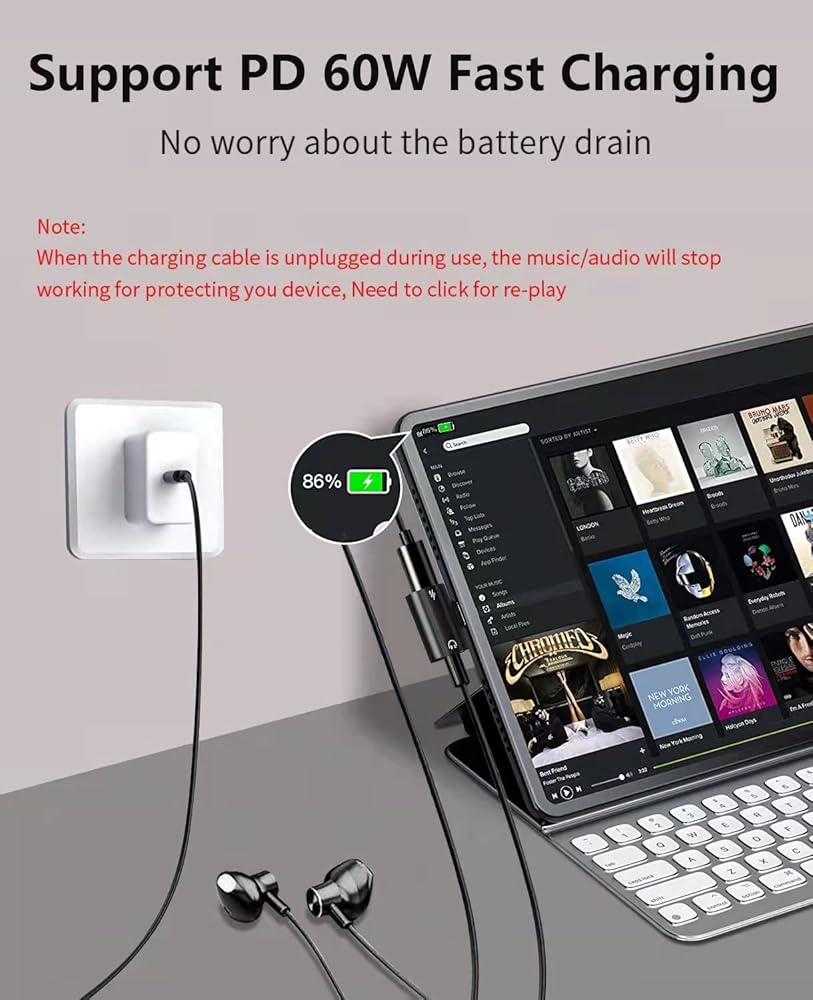 Fast Charging: This 2 in 1 Type C headphone adapter supports PD3.0 fast charging with a maximum output of 60W. With this Type C to Aux Audio Jack, you can quickly charge your devices at any time and don't suffer low battery anxiety.