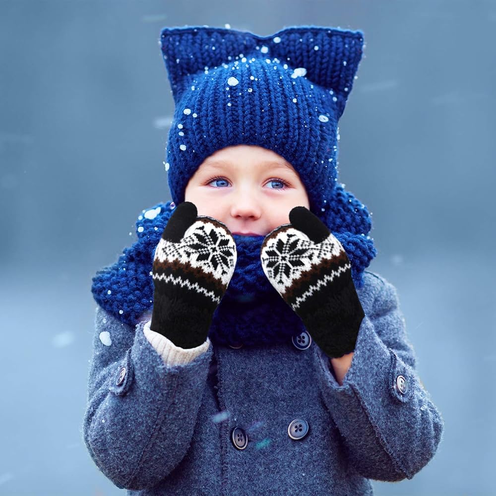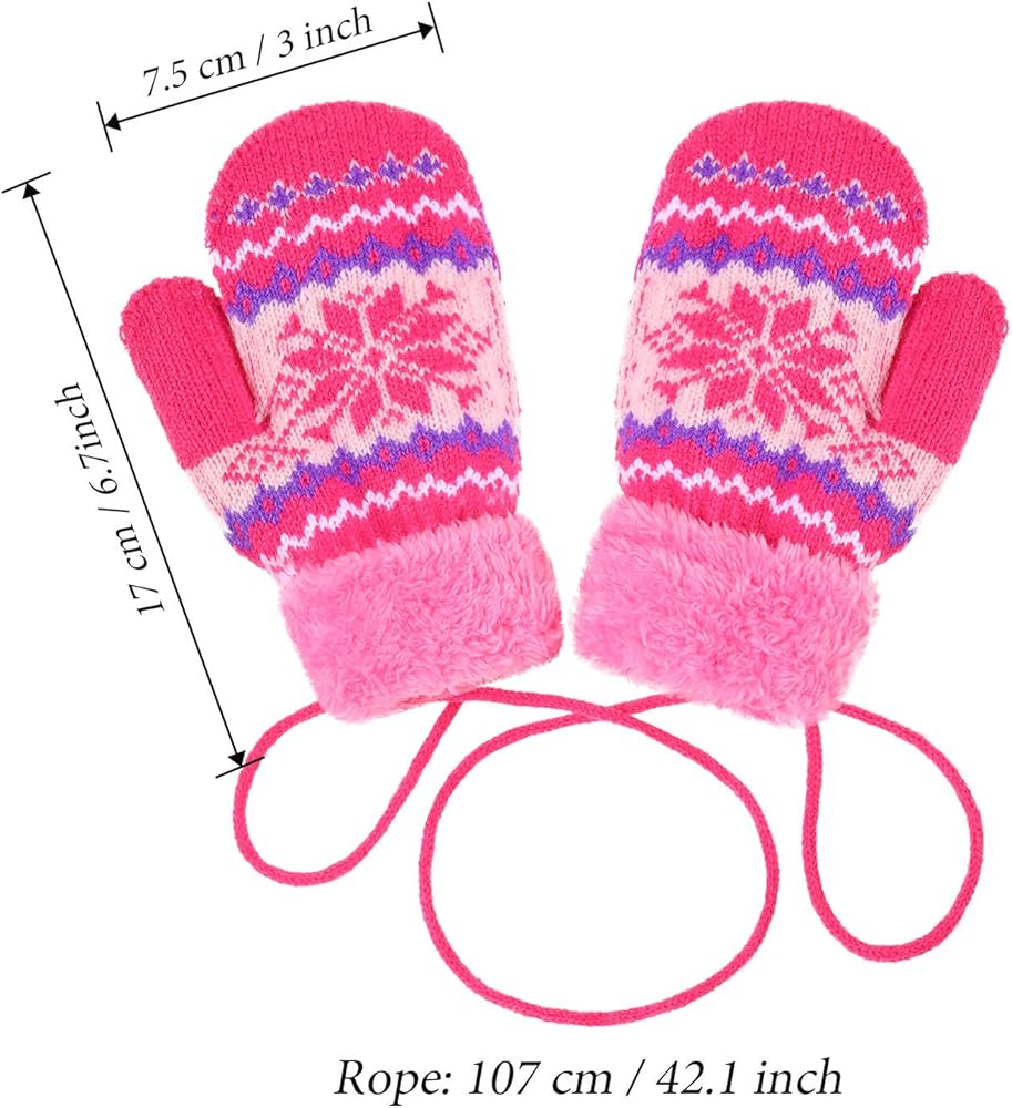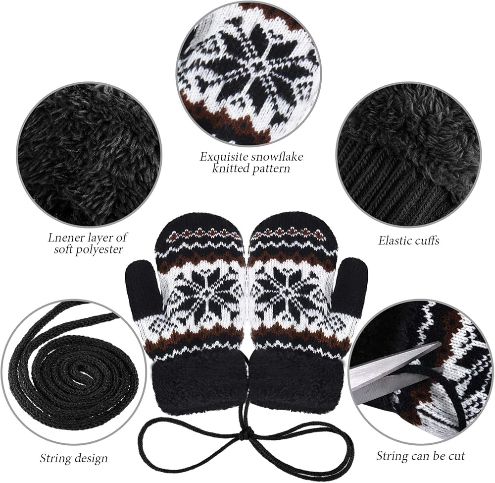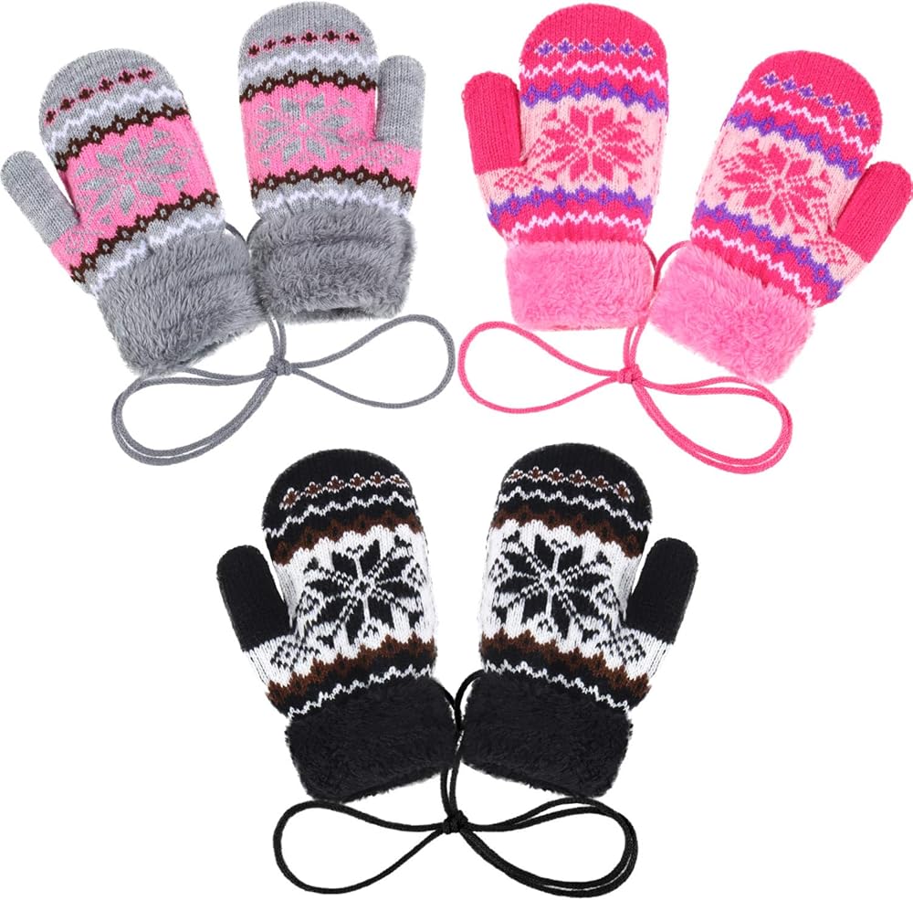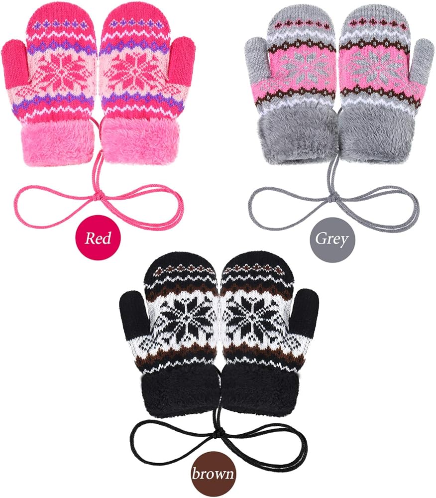3 Pairs kid warm snowflake mittens fleece lining knit thicken gloves with string