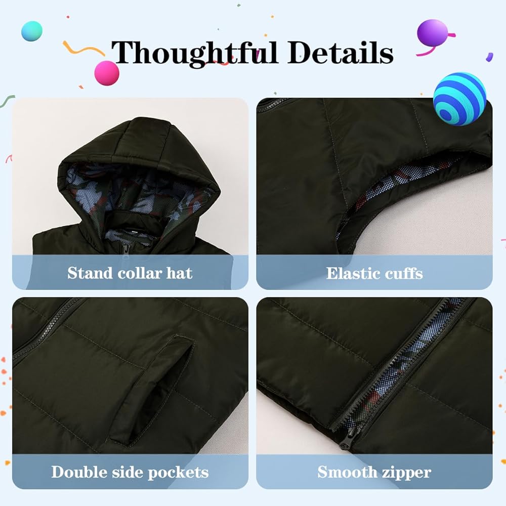 Child-friendly Design: Our down vests feature a hat, stand collar and sleeveless design to ensure active children have unrestricted mobility. The front zip closure and two pockets add convenience to children's clothing, allowing them to carry small essentials or keep their hands warm on the go.