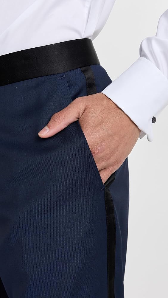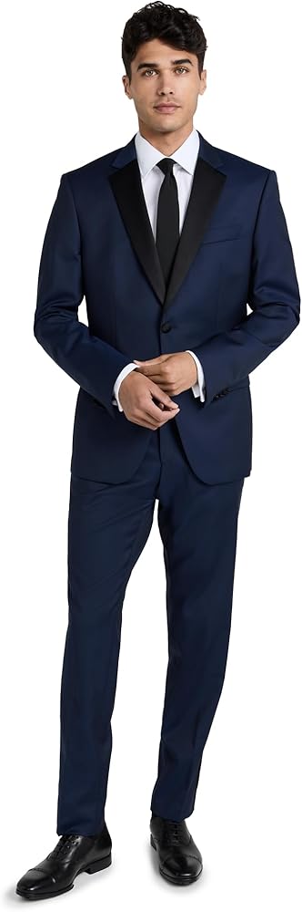 Notched lapels and single-breasted button placket , Long sleeves with button cuffs and padded shoulders, Welt breast and flap front pockets, Interior jacket welt pockets with button closures, Double back vent, Pant cuffs come unhemmed for customizable tailoring
