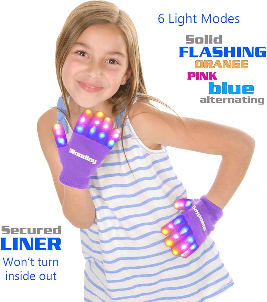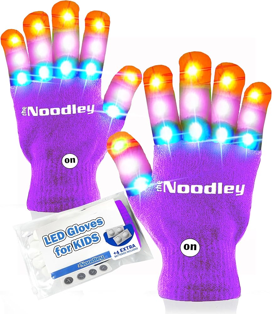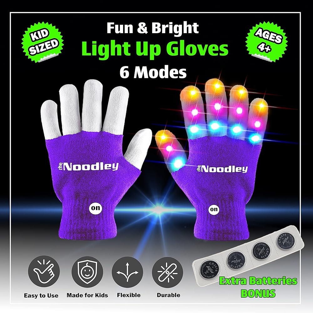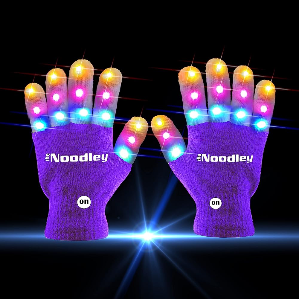 The Noodley Funky Flashing LED Children Glow Gloves are great for kids and adults of all ages. Create your own light show at parties, concerts, weddings, dancing, and other entertainment events. These luminous glowing gloves will sure to be a big hit skating. Children love light toys for birthday party favors, and no clown outfit is complete without rainbow glowing finger gloves! Make your own glow costume, or a perfect Halloween accessory. Children's LED gloves will keep little hands warm Trick or Treating and provides night time safety. Unique fun gift idea for New Year's Eve, July 4th, St. Patrick's Day, Valentine's Day, Christmas presents or the small size is perfect for stocking stuffers. Can be worn year round from camping and summer nights to cold winter days. For kids age 4, 5, 6, 7, 8, 9, 10, 11, 12, 13, 14, 15, 16 year olds and even adults. Lights soothe as stimulation to fascinate autistic children with autism and other sensory disorders. Popular with children and tweens, flashing glowing fingers are great for birthday presents, play fun, party favors, teenager things, ninja cosplay, robot hands, and Easter baskets fillers. Great kids camping flashlights to find your way in the dark. Grab some of these hot novelty gifts! Extra batteries can be save for later. Not waterproof. Kids light-up gloves, kid-friendly lighted gloves, illuminated gloves for kids, lighted gloves for toddlers, fun light-up gloves for children, child-size LED gloves, colorful light-up gloves for kids, flashing gloves for kids, kid's glow gloves, playful light-up gloves, lighted gloves for young ones, children's LED party gloves, kids' novelty light gloves, kids' winter gloves with lights, kid's outdoor lighted gloves, light-up gloves for kids' events, youth LED performance gloves, kid's dance gloves with lights, and glow-in-the-dark gloves for kids.