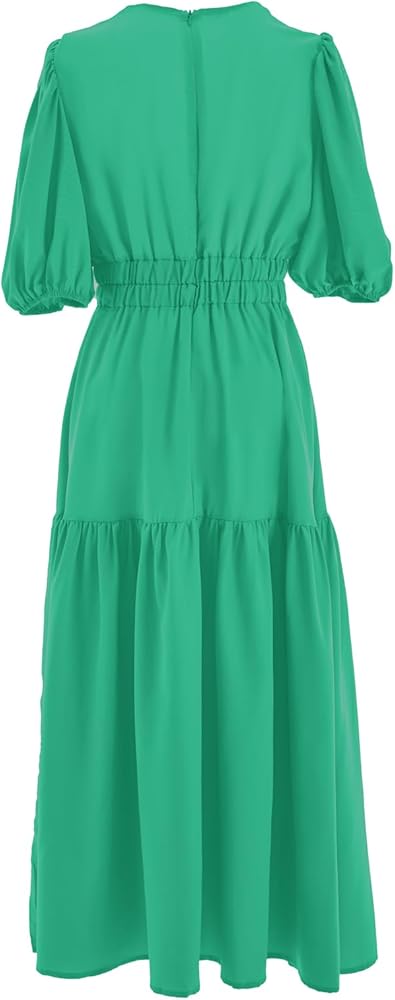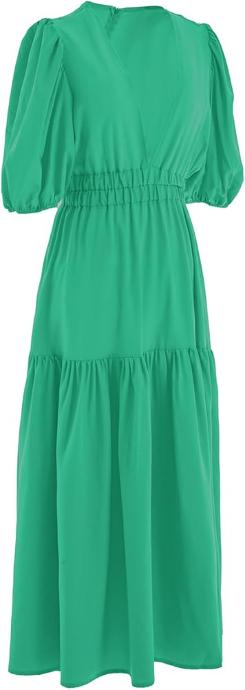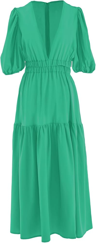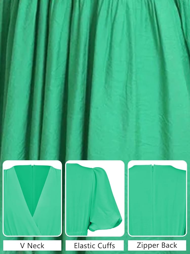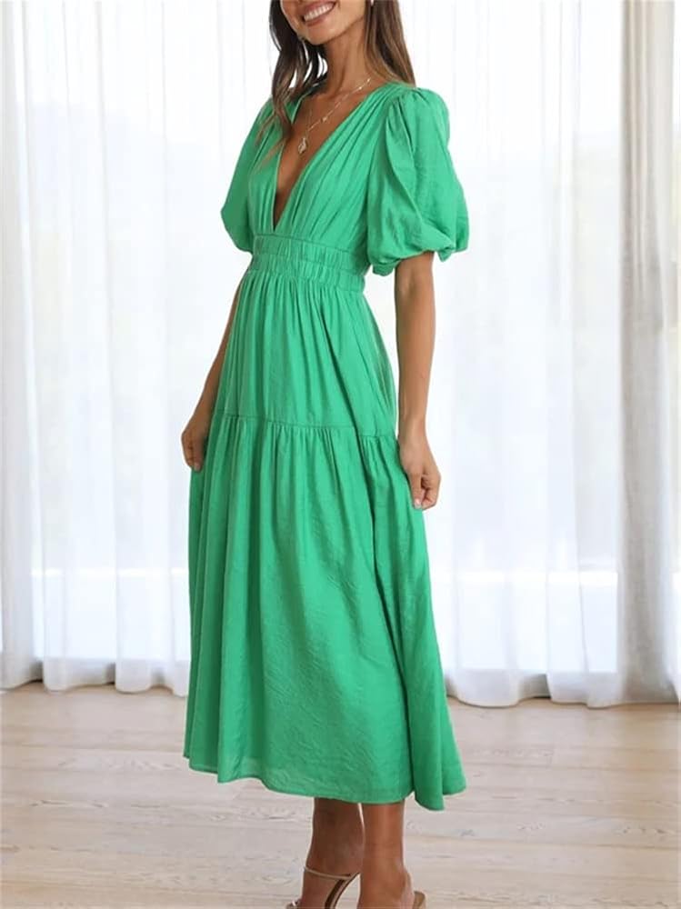 Feature: Short sleeve, puff sleeve, deep v neck, solid color, elastic high waist, a-line, ruffle hem, zipper back, ruched design, mid length, elegant, sexy, fashion, casual, tiered flare sundress, summer swing dress, beach flowy dress