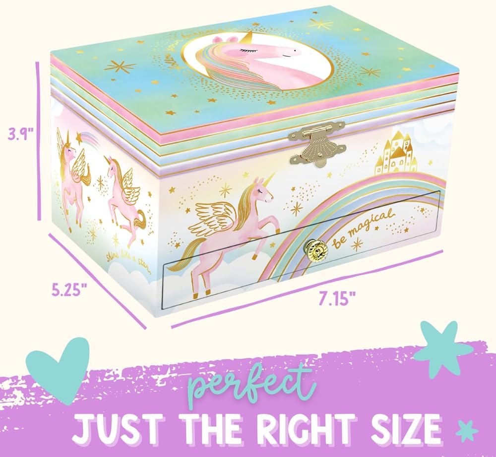 Indulge in the magical world of our girls unicorn musical jewelry box, a treasure that transcends time and generations. Designed to captivate girls aged 3, 4, 5, 6, 7, 8, 9 & 10, and evoke beloved memories in the gift giver, each opening of the little girl jewelry box sparks wonder, imagination and timeless memories.