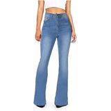 Blue Flare Jeans Style: The Shape of these flare jeans is designed with you in mind, with a few figure and curve enhancing tweaks to give you the perfect fit. Featuring a blue washed denim material with button fastenings, zipper fly, distressed knees, and a flared hem to the bottom.