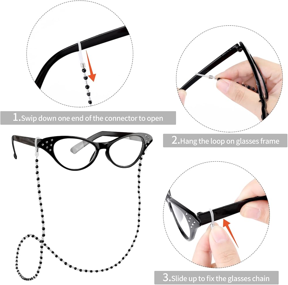 Delicate Accessories: The necklace and bracelet are made of artificial pearls and durable metal buckle; the delicate pearl necklace can show the advantage of your slender neck and the pearl bracelet will add a unique sense of charm; the black cat's eye shaped glasses adopt crystal in the edge, with a glasses chain, it looks more elegant and beautiful; the glasses will make you look more lovely and add a sense of the old lady
