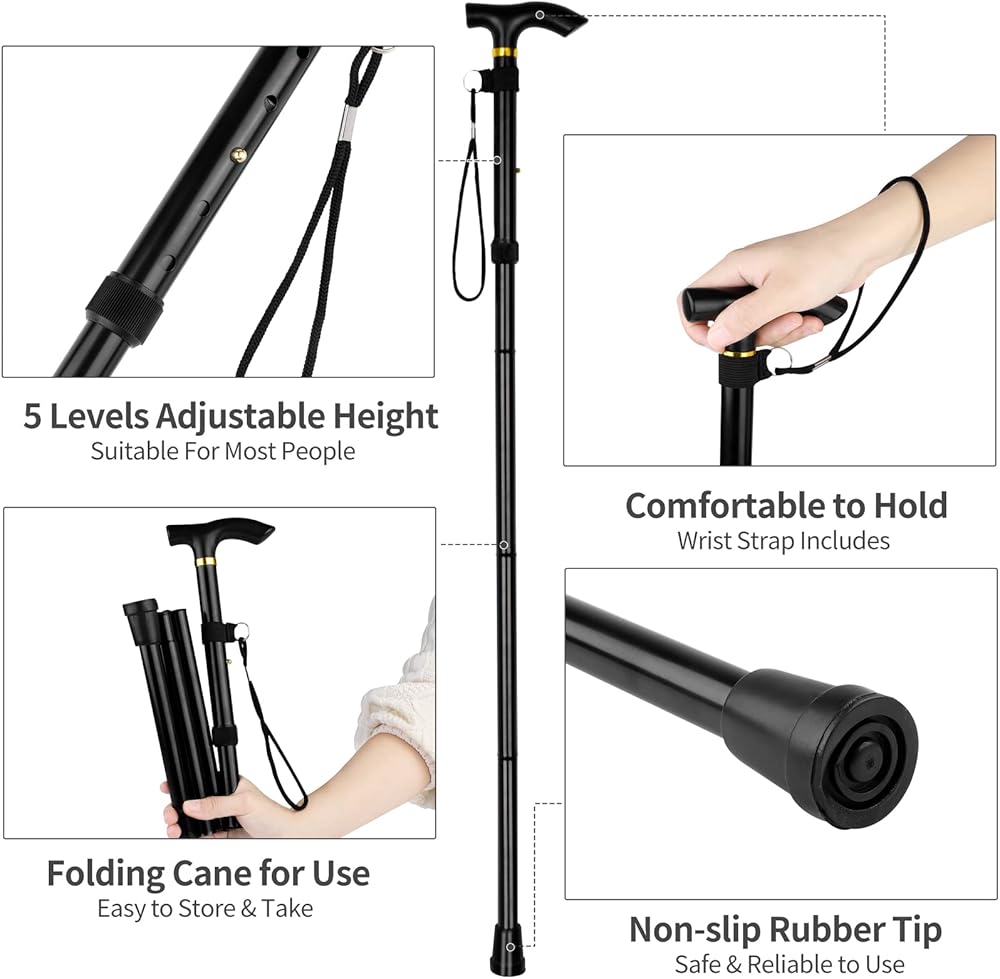 Adjustable Anti-Slip Cane: The 85-95 cm black telescopic cane is made of aluminum alloy, which allows it to be durable and sturdy; besides, the cane has many design details such as a comfortable handle, thickening non-slip design at the bottom, five different length gears that can adjust the height to satisfy different people's needs, 4-section folding design that makes it easier to store and saves storage space