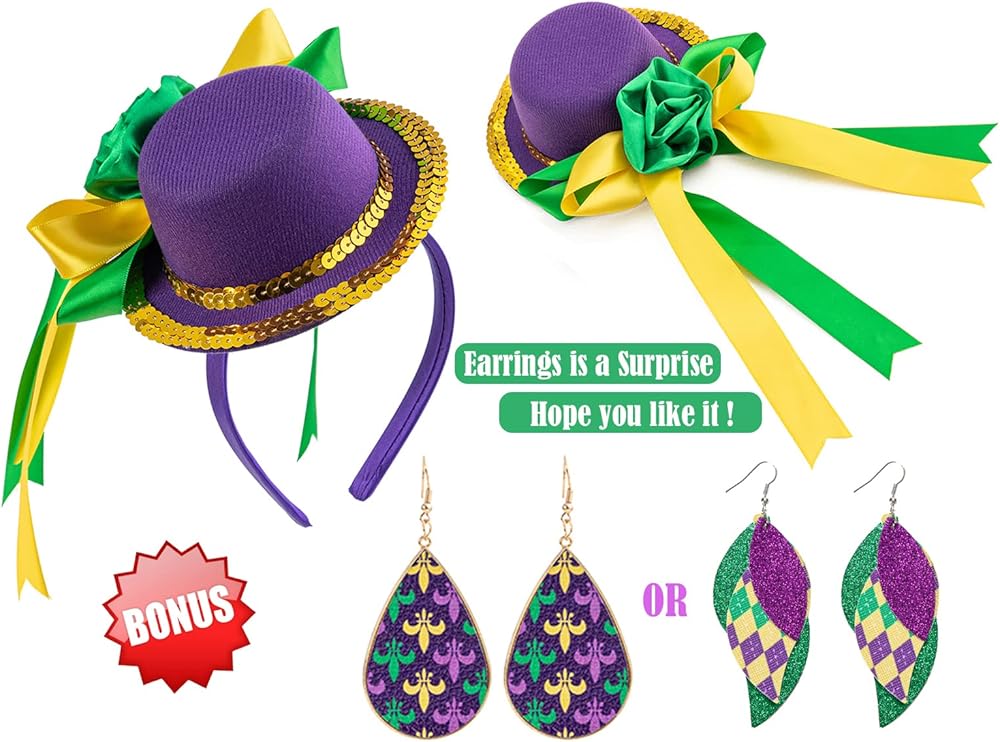 ♚Package Includes♚ 1×mini top hat & 1×Purple Headband & 1× hair Clip & 1 pair of exquisite mardi gras Earrings! The earrings matches the mini hat perfectly suitably! Perfect favor or addition to your costume or photo booth props! One of the perfect choice to make you more attractive and adorable in festivals, party,etc.