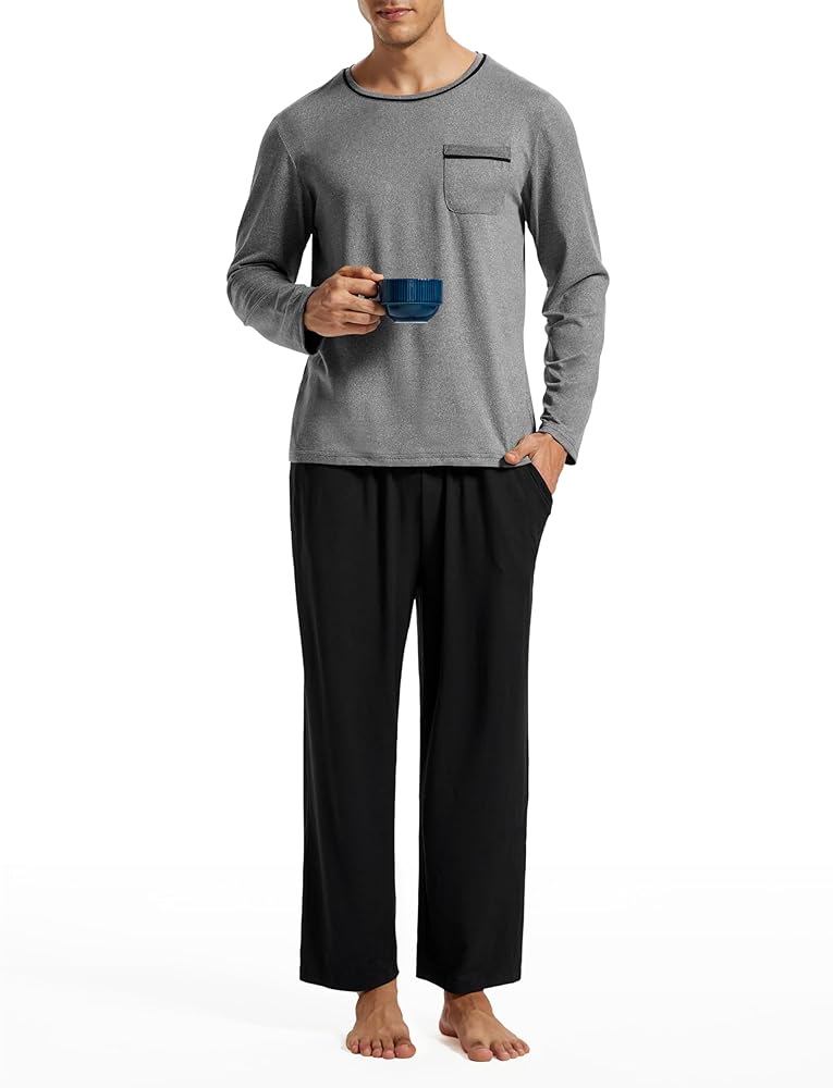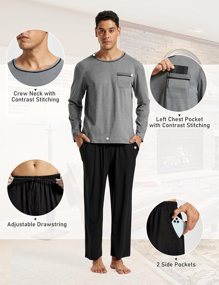 【Pajama Tops with Pocket】-Men's pajama sets come with classic pullover pajama tops with long sleeves and crew neck, and a chest pocket to store your belongings. men's loungewear set features stretchy fabric and loose-fitting design, to make you feel comfy and relaxed.