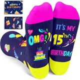 BIRTHDAY SOCKS: These socks are perfect for teen boys and girls. The socks feature birthday gifts, balloons, cakes, and other elements on the top, while the bottom features a hilarious secret message written in non-slip ink: "OMG! IT'S MY 14TH BIRTHDAY."