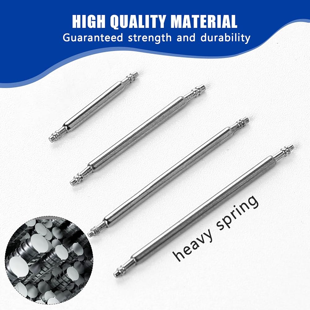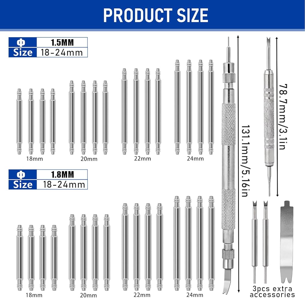 STRAP PIN SIZE - Watch band tool kit has 1.5mm and 1.8mm diameter and 18mm, 20mm, 22mm, 24mm length respectively, 4 of each size, 32 in total, suitable for repairing all kinds of watches (please confirm the size of the spring pin before purchase)